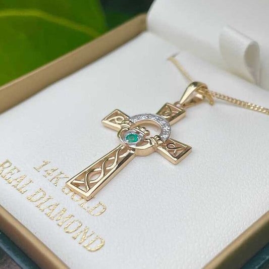 14k Gold Diamond and Emerald Claddagh Cross Unveil a harmonious fusion of traditions with our...