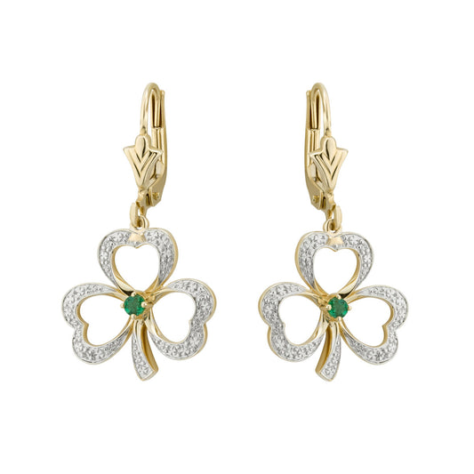 14k Gold Diamond & Emerald Shamrock Drop Earrings