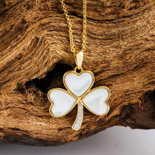 This Shanore Mother of Pearl Irish Shamrock Necklace brings divine blessings. The three-clover Shamrock is...