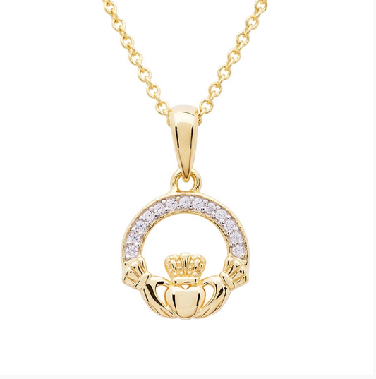 14KT Gold Vermeil Large Claddagh Necklace Studded with White Cubic Zirconias