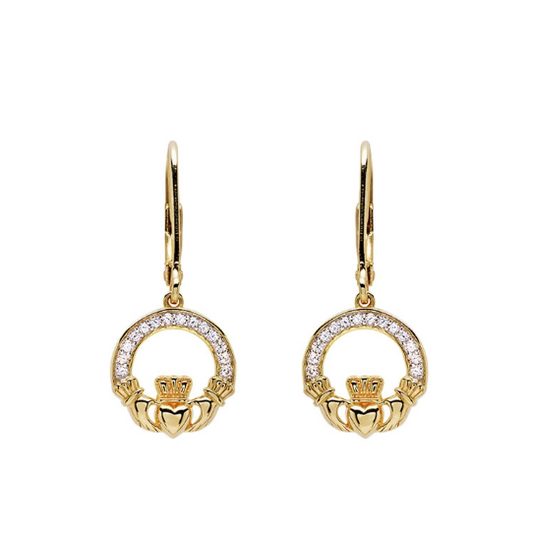 These Shanore 14KT Gold Vermeil Drop Claddagh Earring Studded with White Cubic Zirconias are a...