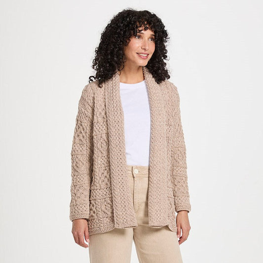 Liffey Ladies Oat Aran Shawl Cardigan The Liffey Ladies Aran Shawl Cardigan showcases a beautiful...