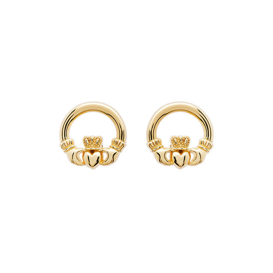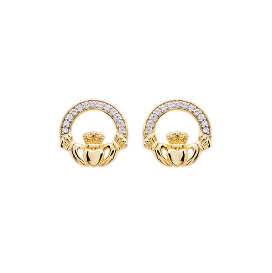 14KT Gold Vermeil Stud Claddagh Earrings Adorned with White Cubic Zirconias