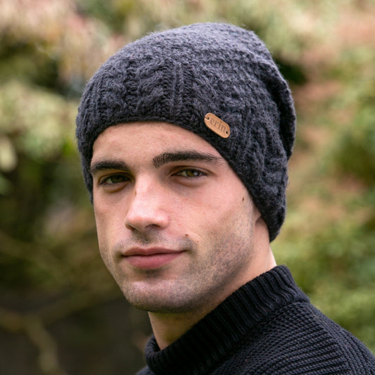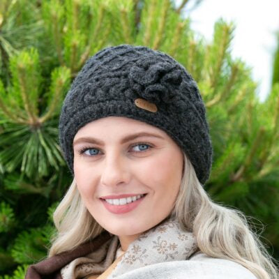 Aran Trellis Peak Hat knitted in a charcoal colour 100% Wool with Polyester fleece lining...