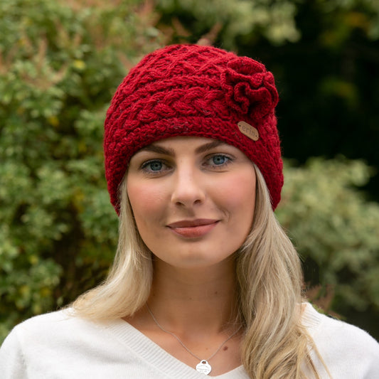 Aran Cable Knitted Wool Headband with Flower Red