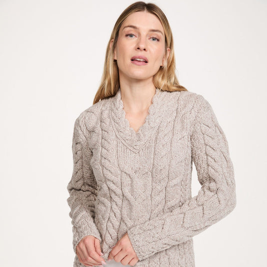 The Tralee Ladies V-Neck Oat Sweater is a refined piece of Aran knitwear with strong...