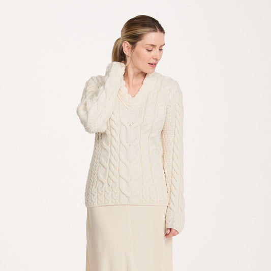 The Tralee Ladies V-Neck Natural Sweater is a refined piece of Aran knitwear with strong...