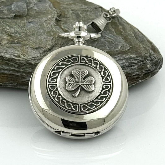 Mullingar Pewter Mechanical Pocket Watch with Shamrock Design