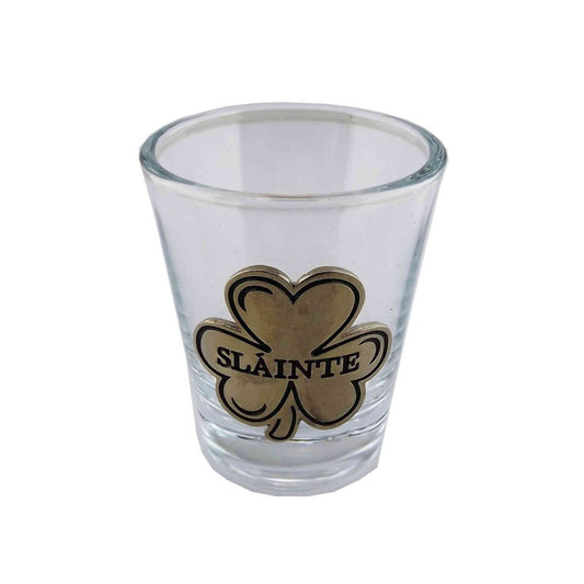 Get a drink or two with this shot glass with a shamrock design. Irish word...