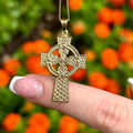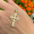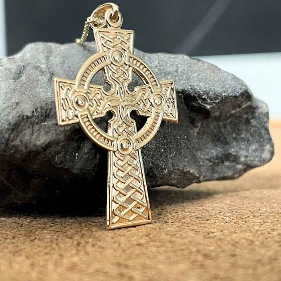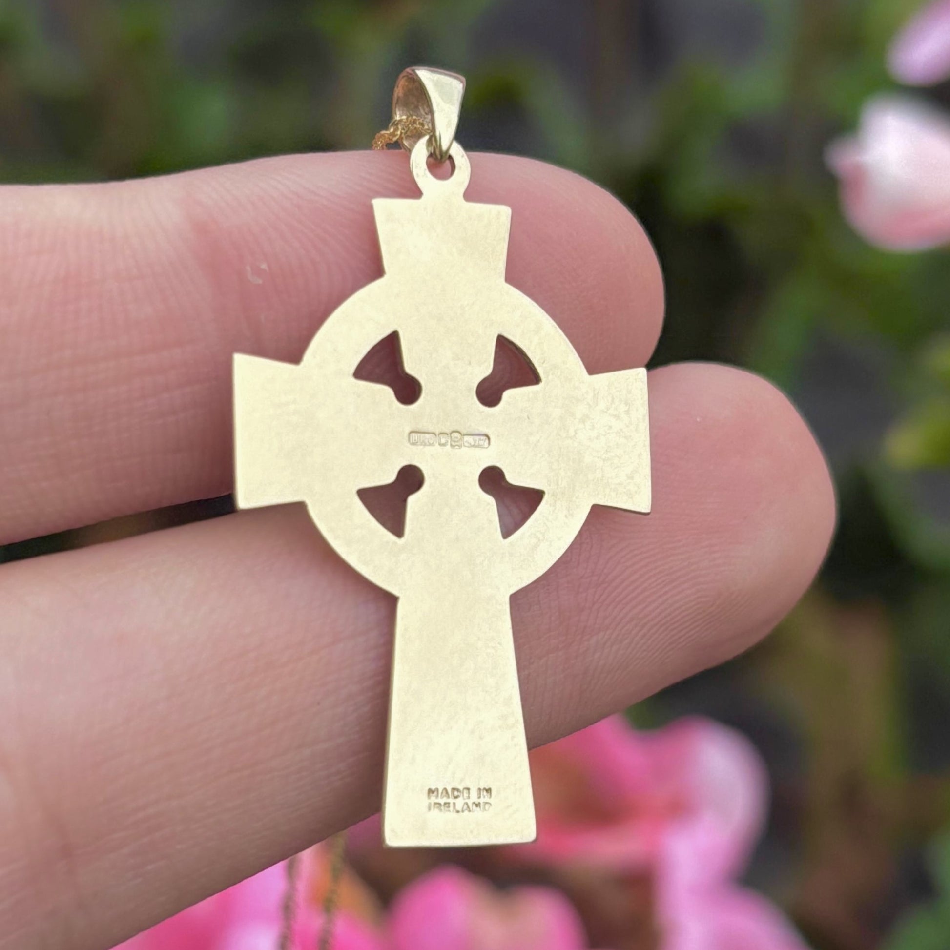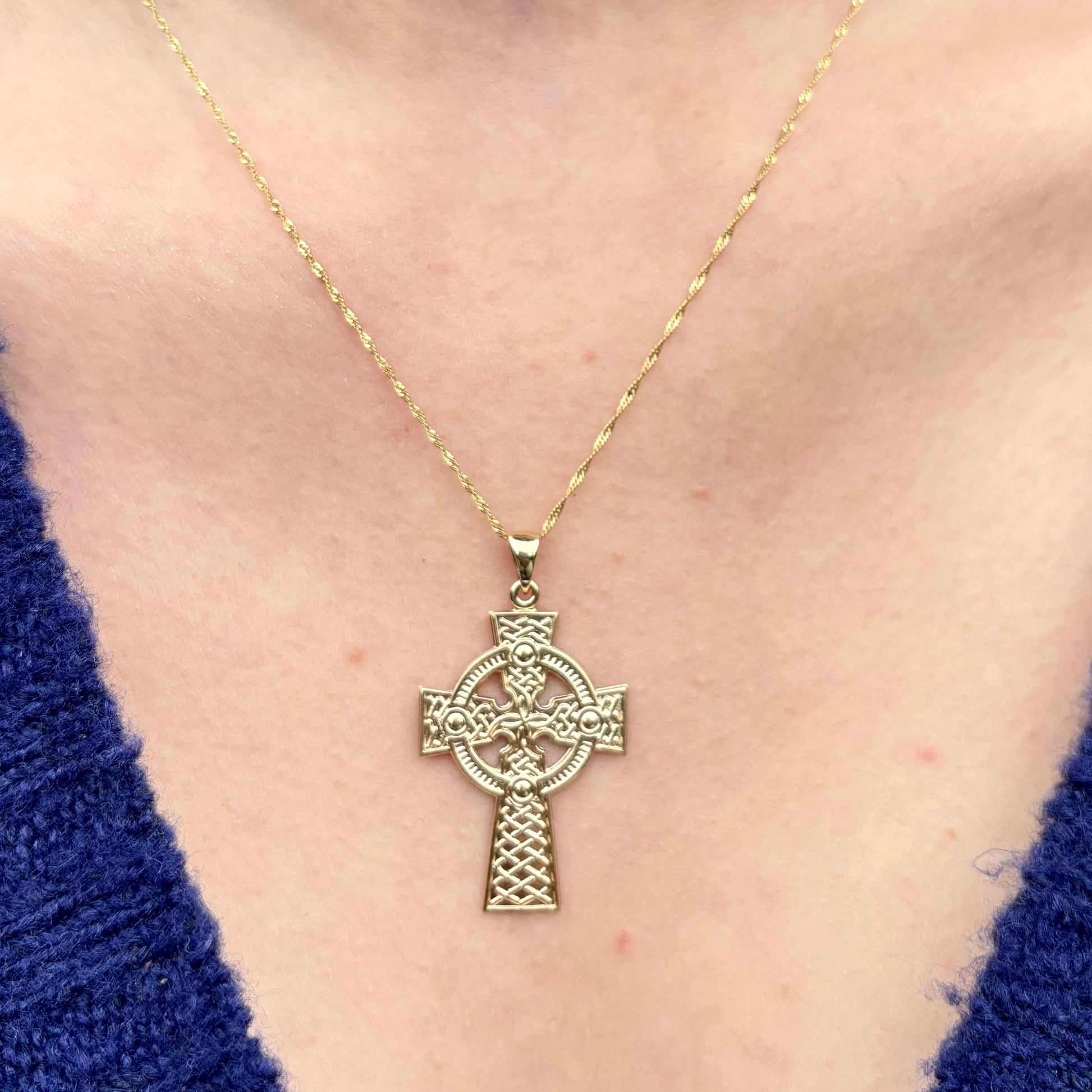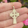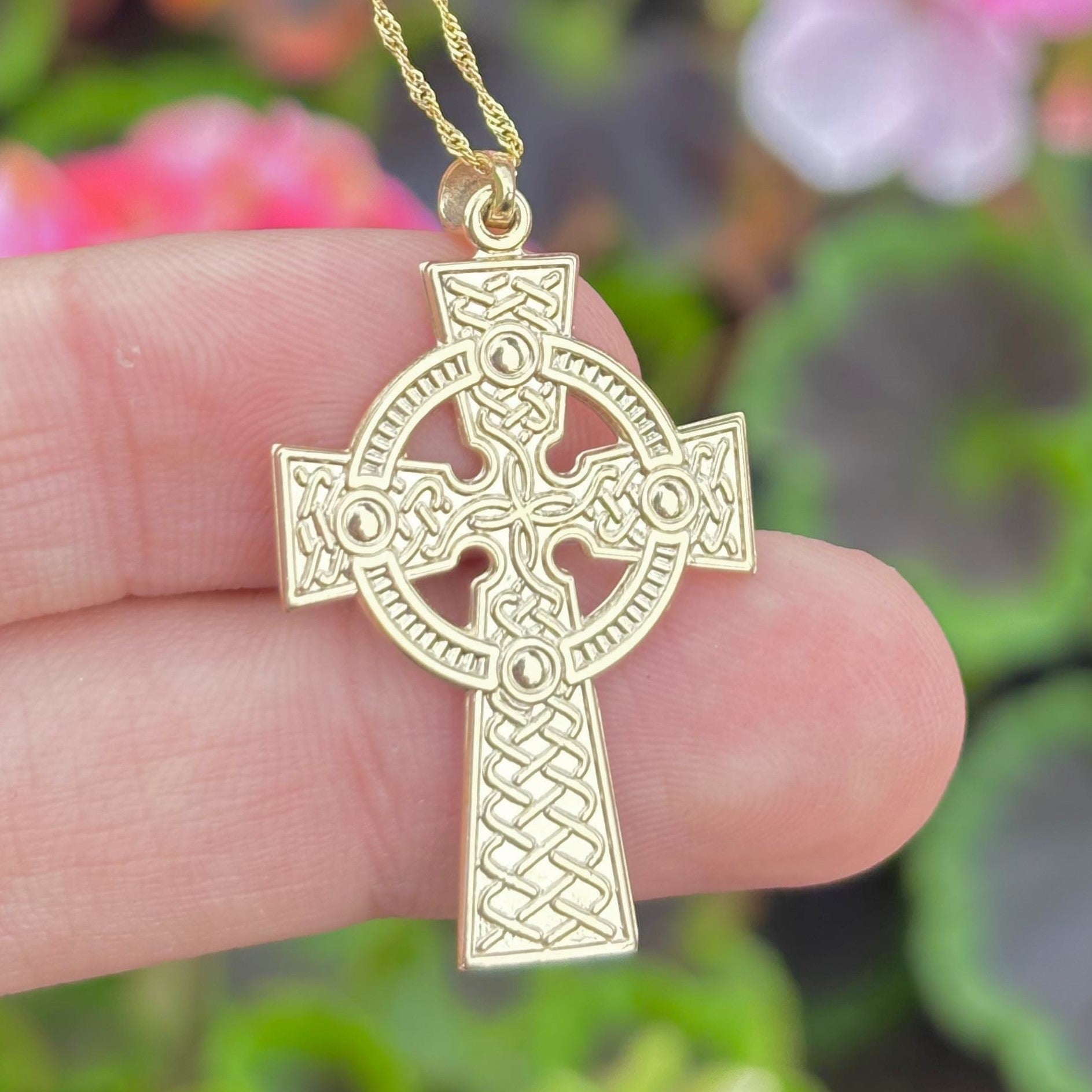 This beautiful 10k Yellow Gold Celtic cross has an intricate knot pattern and is completed with classic sun circle. The necklace is available in three sizes and comes fitted with an 18 inch yellow gold chain. This Celtic cross pendant is cast in the finest hallmarked 10k yellow gold and is hallmarked at the Irish Assay Office in Dublin Castle. Guaranteed Irish jewelry shipped for free from Ireland.