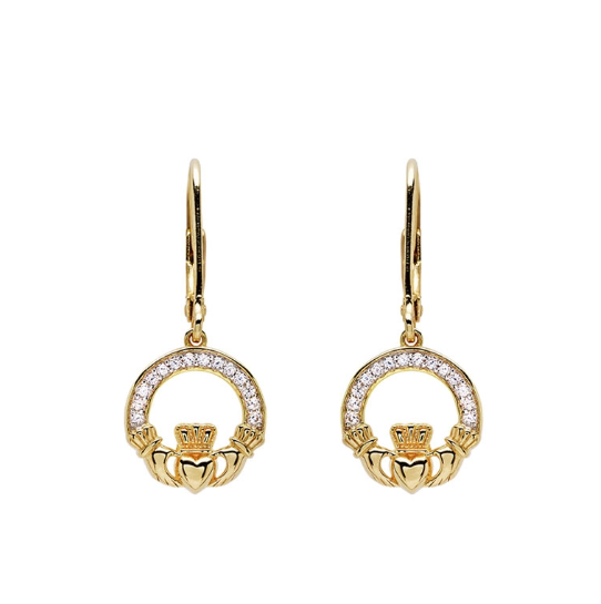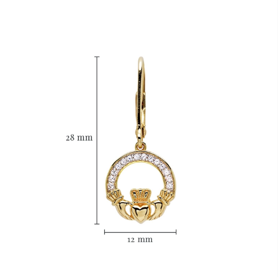 14KT Gold Vermeil Drop Claddagh Earring Studded with White Cubic Zirconias