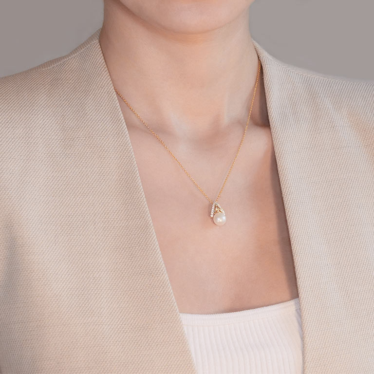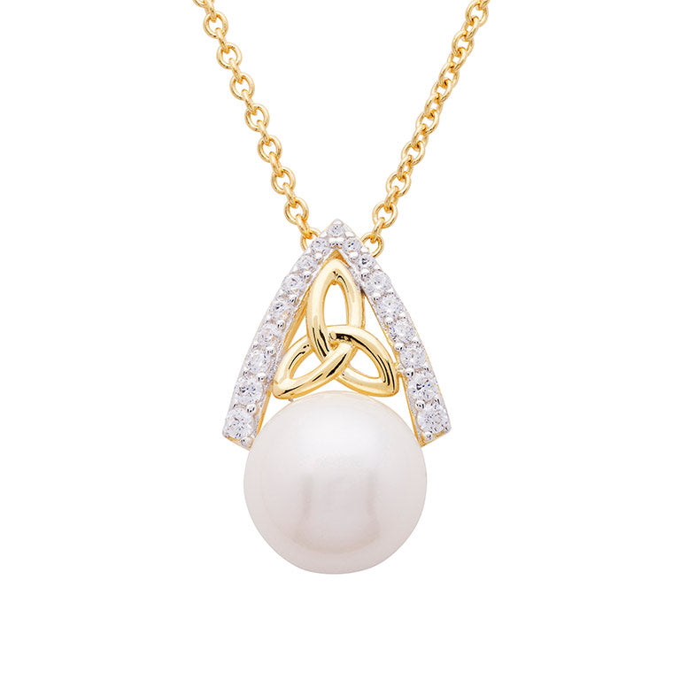 This Shanore 14KT Gold Vermeil Trinity Knot Pearl Pendant Studded with White Cubic Zirconias is a stunning piece full of Celtic Meaning. The Trinity Knot symbolizes faith and eternal connection. On the other hand, the pearl represents wisdom and life experience. Similarly, pearls offer protection, attract good luck and wealth. With this magical combination, this piece talks about everlasting wisdom and protection. The perfect gift for a woman that is both classic and elegant.
