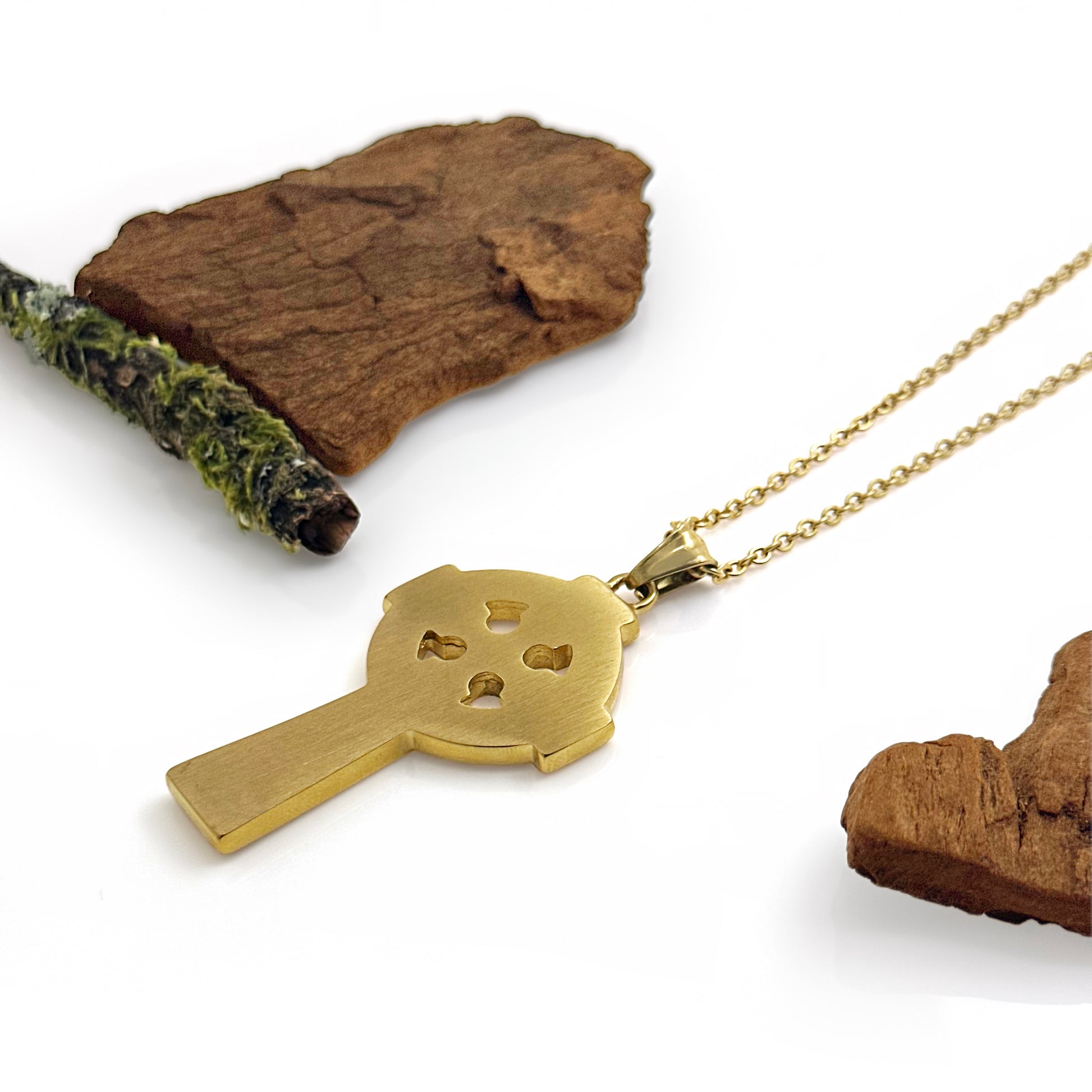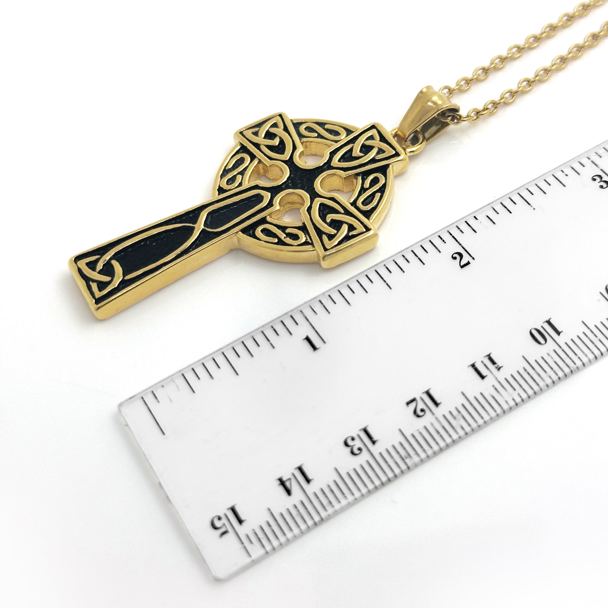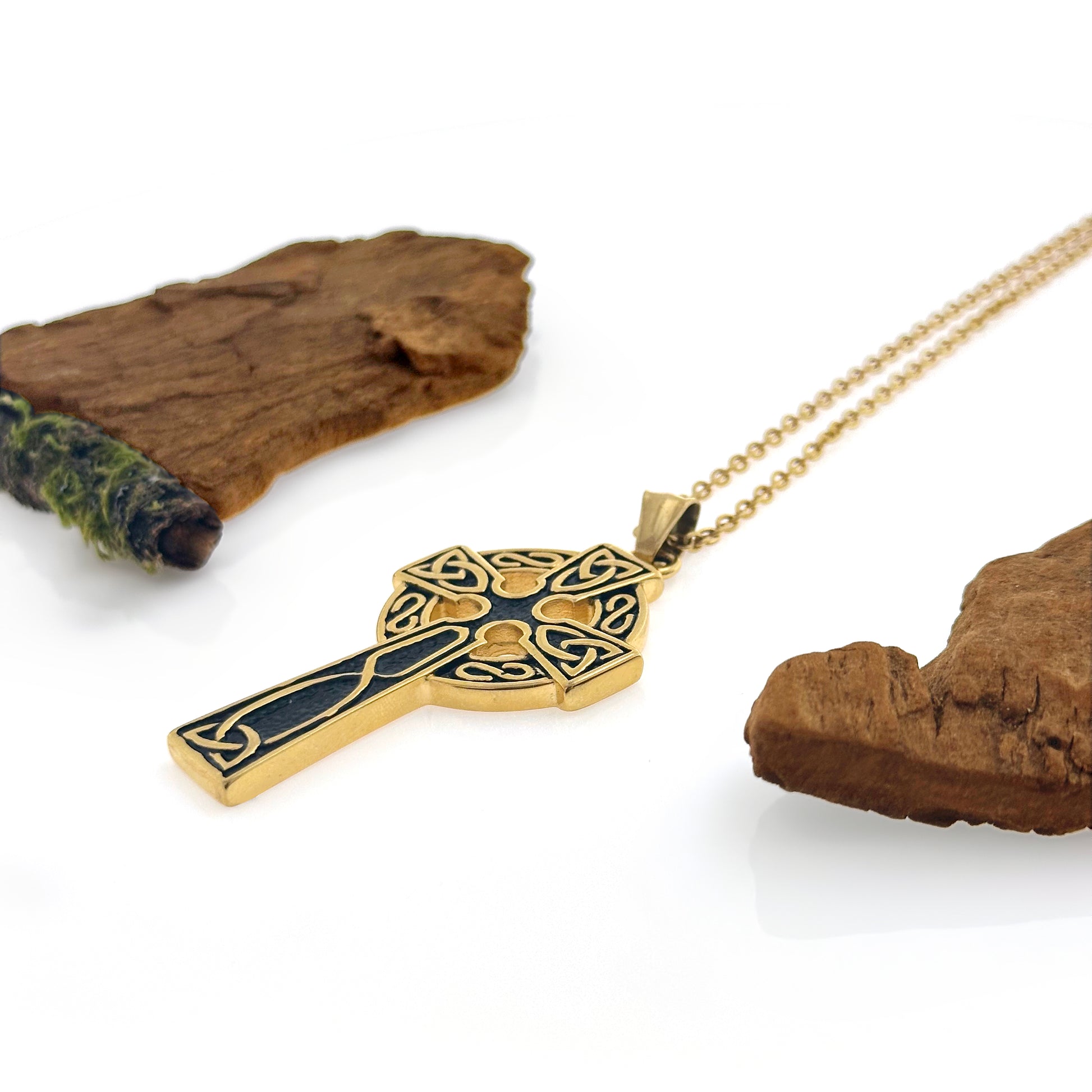 Stunning, heavy, solid, tough traditional 18k gold plated stainless steel Celtic cross necklace for men.