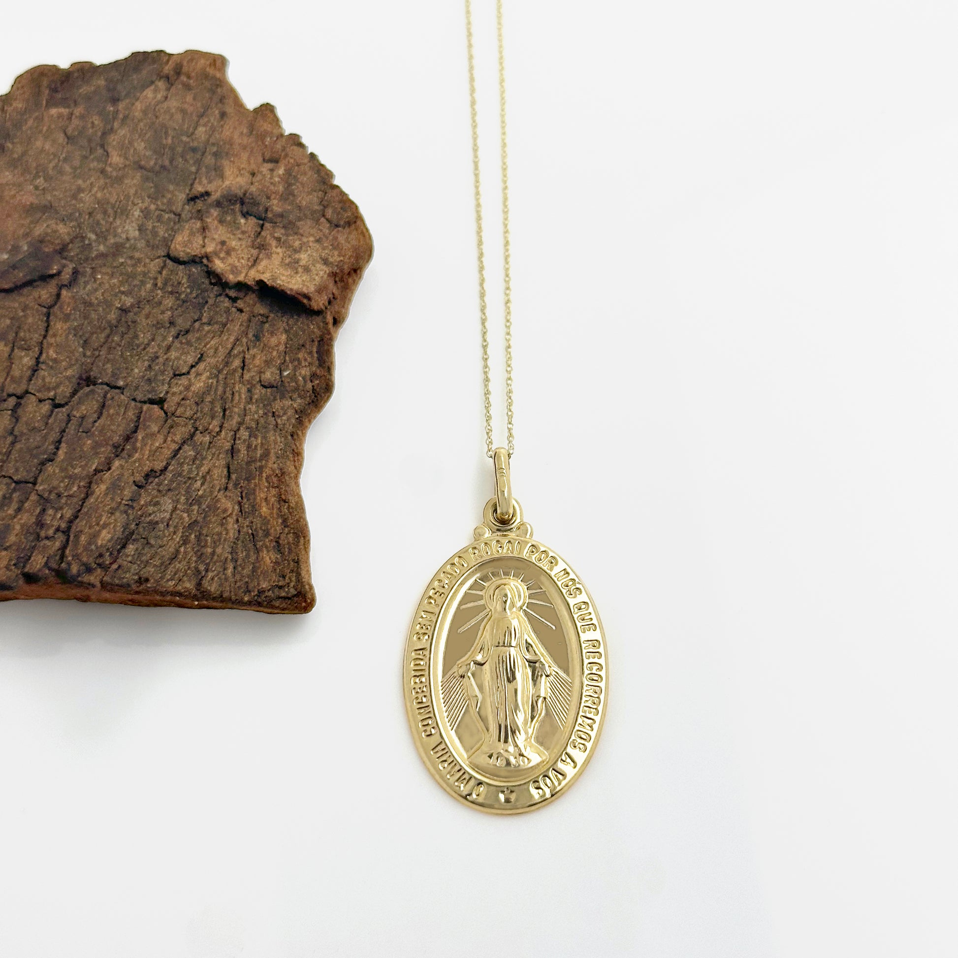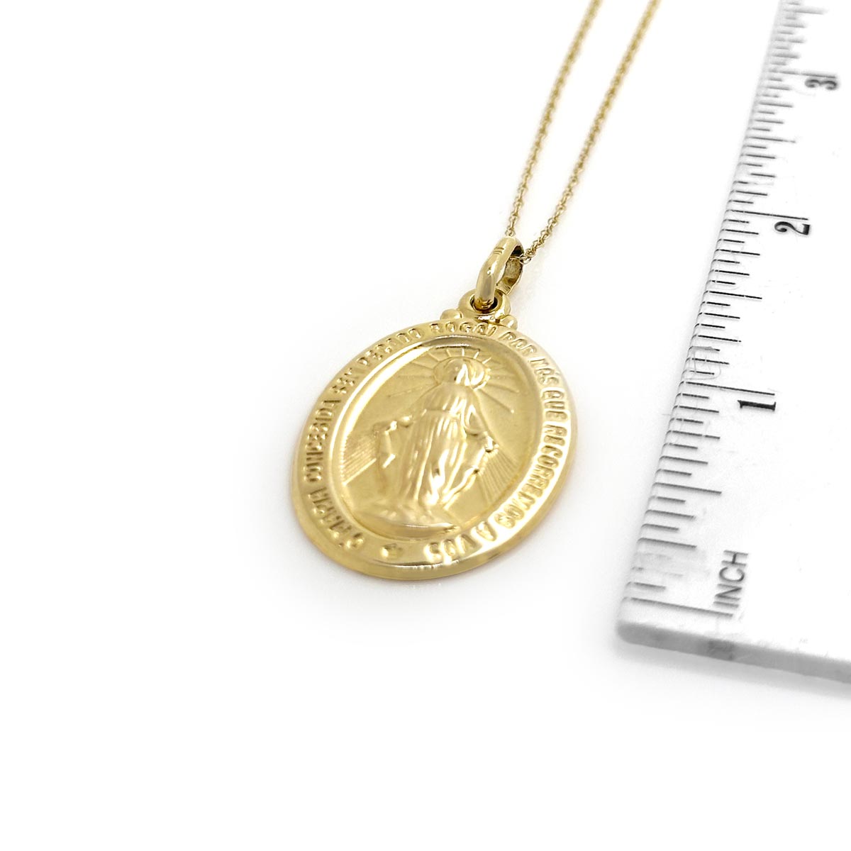 Large 9ct yellow gold Miraculous medal with inscription engraved on border.