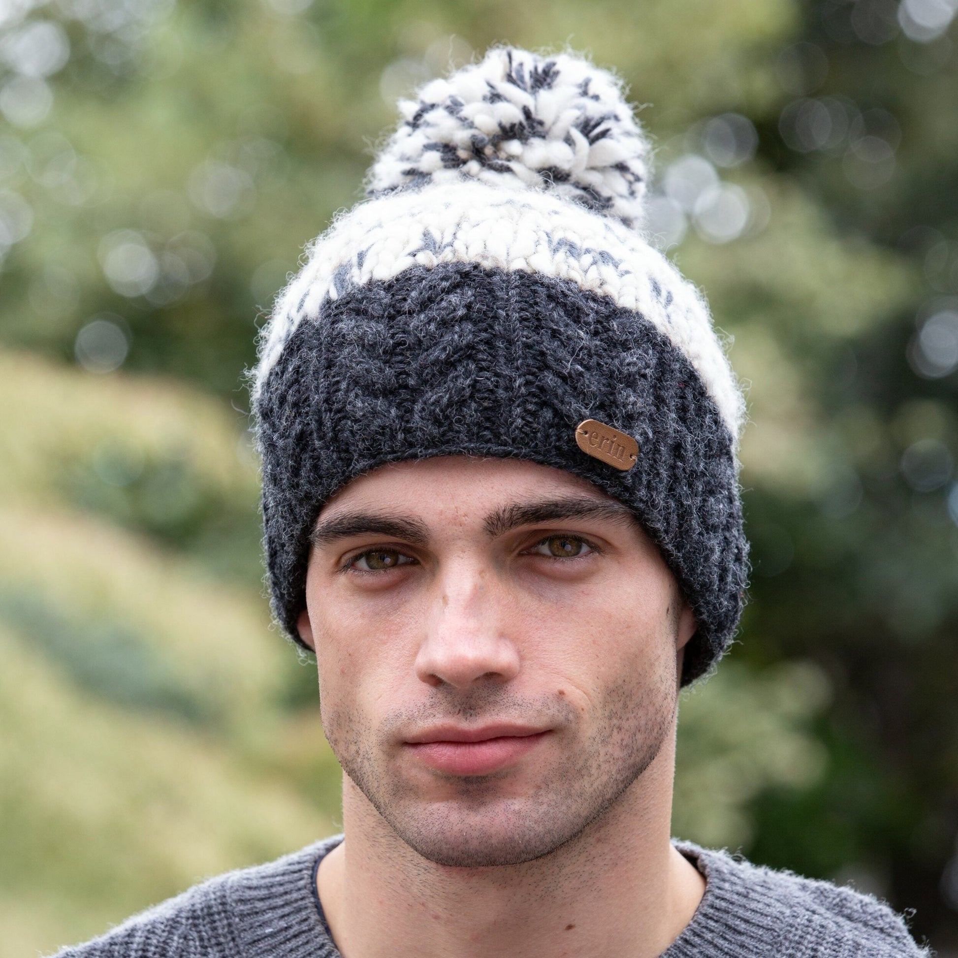 Luxury Thick Knitted Bobble Hat with flecked yarn and a Charcoal coloured Aran Cable Knit Band. 100% Wool with Polyester fleece lining for extra warmth and comfort.