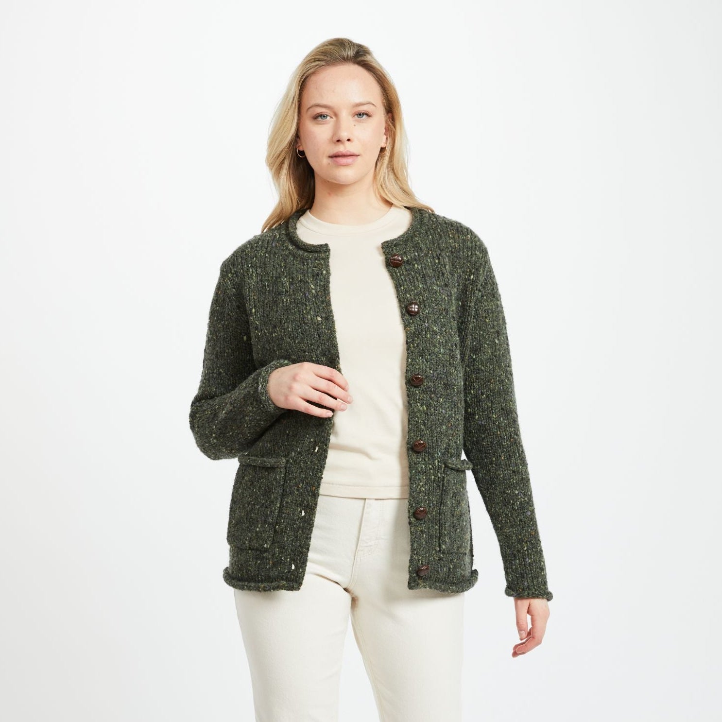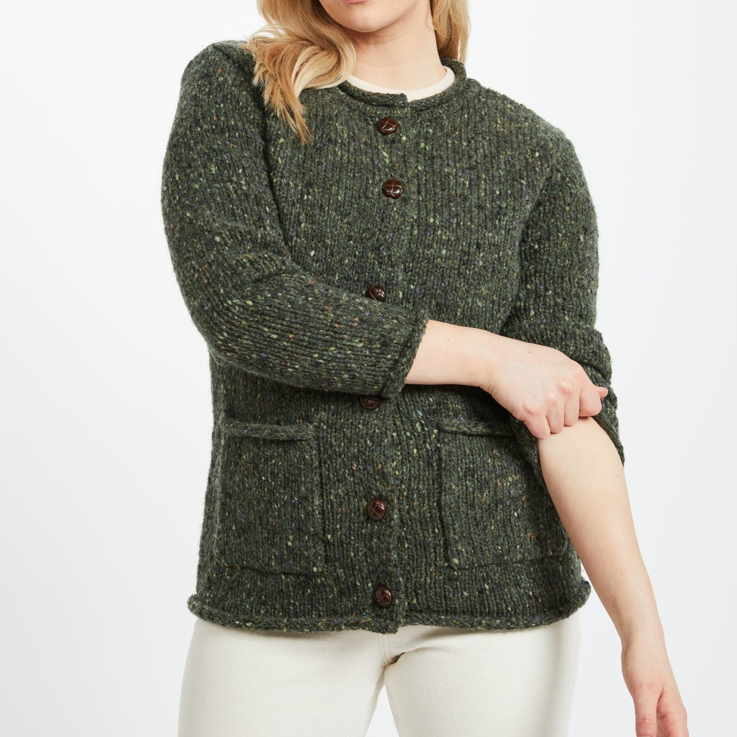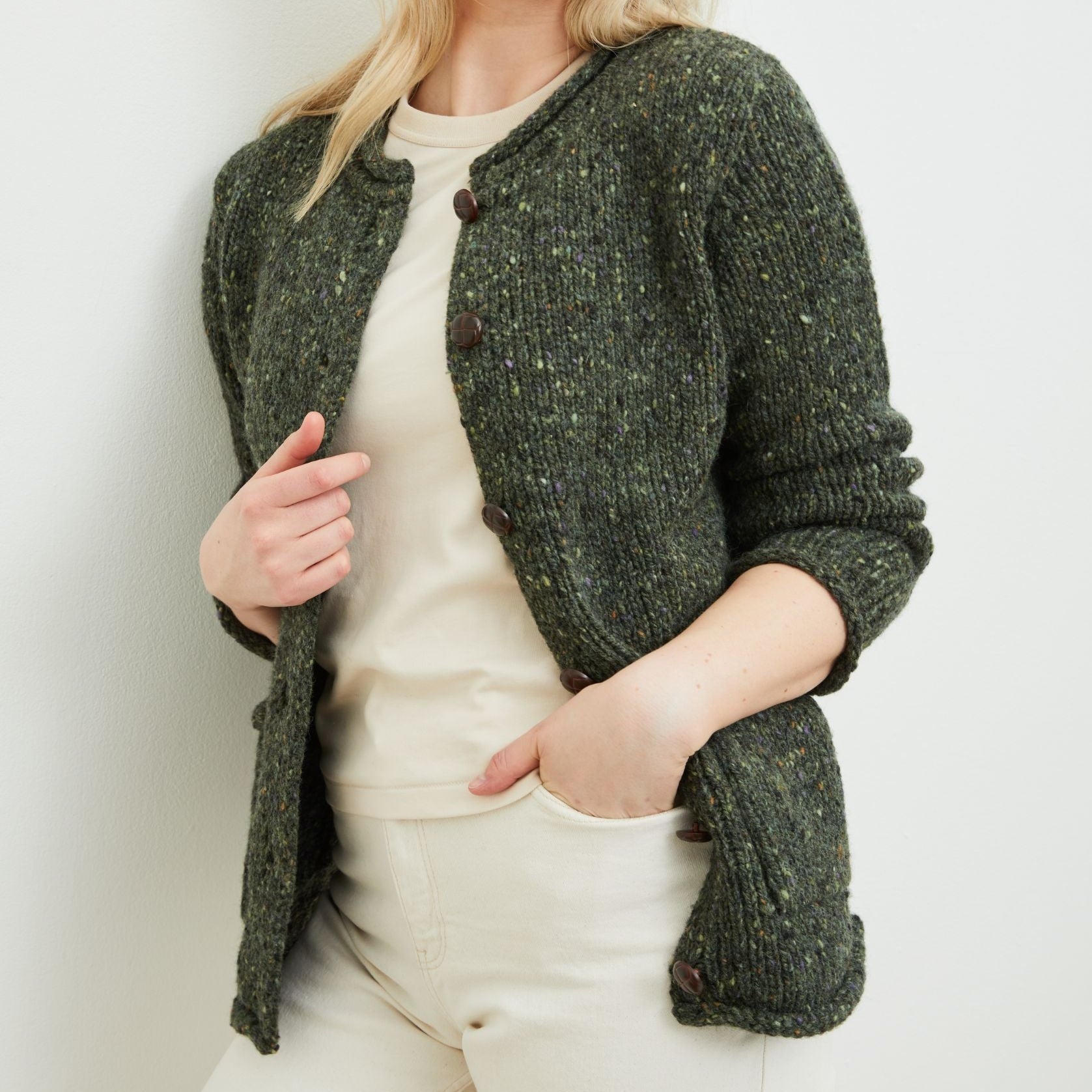 The Avondale Ladies Tweed Green Cardigan is a polished piece of Irish knitwear that brings structure and comfort together effortlessly. Crafted from premium wool, it offers dependable warmth while remaining breathable and comfortable for all-day wear. The tailored fit creates a clean, flattering shape, while the subtle grey tweed tone gives it depth and quiet character. Intricate button detailing adds interest without overpowering the design, and the ribbed hem and cuffs provide a neat, secure finish. It’s a cardigan that feels refined yet practical — ideal for layering over a blouse, knit top, or dress when the temperature drops.
