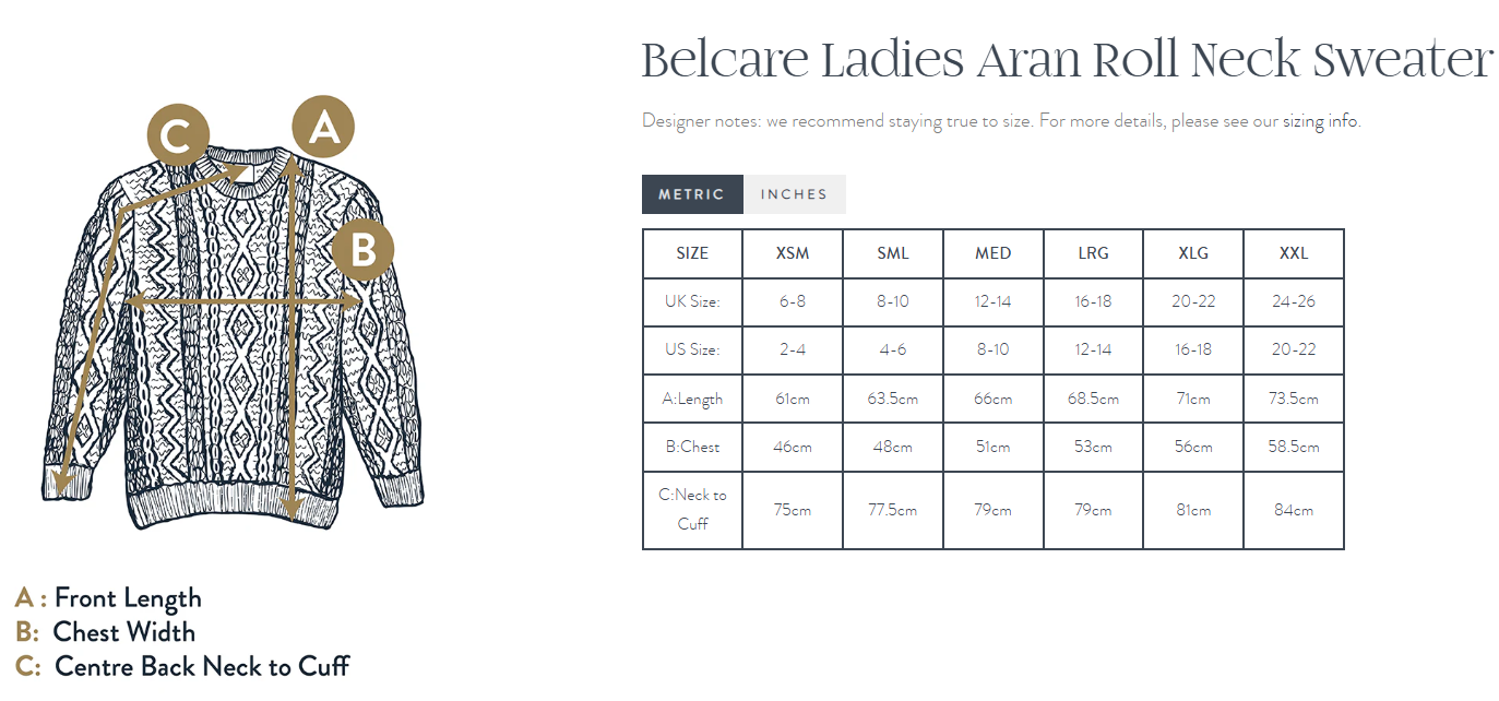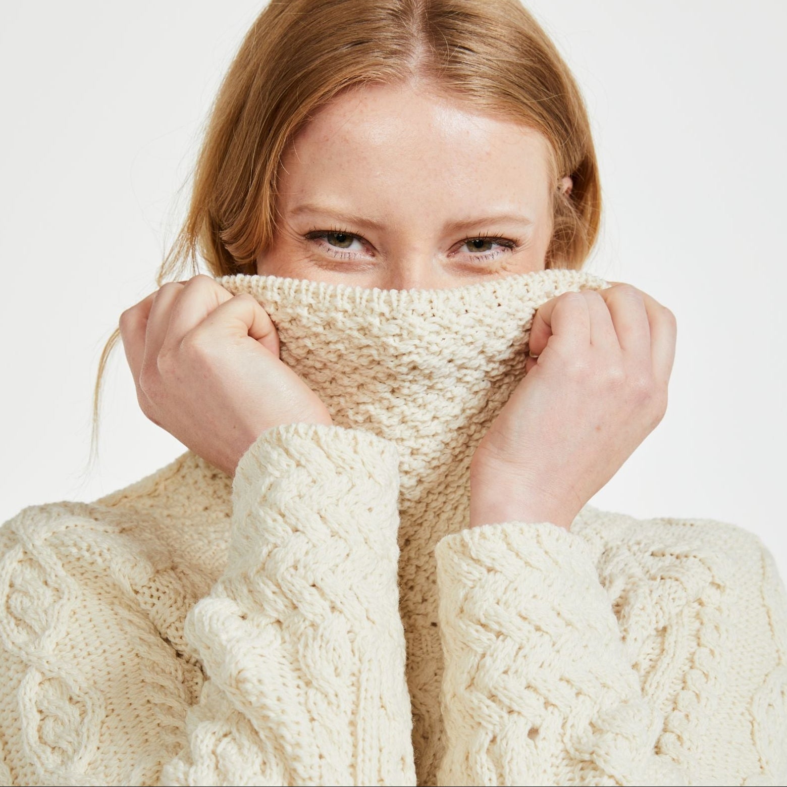 Introducing the Belcare Ladies Aran Roll Neck Sweater, a timeless addition to your winter wardrobe. Crafted with precision and care by Aran Woollen Mills, this sweater embodies comfort, style, and quality craftsmanship. Whether you're exploring the outdoors or enjoying a cozy night in, the Belcare sweater promises to keep you warm and chic.