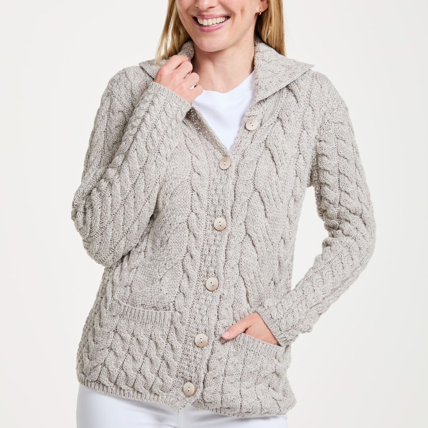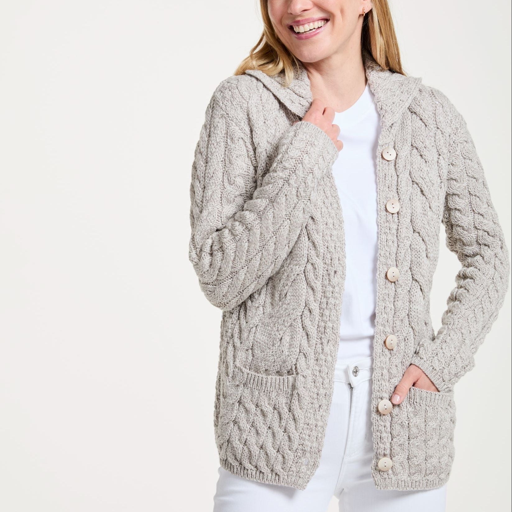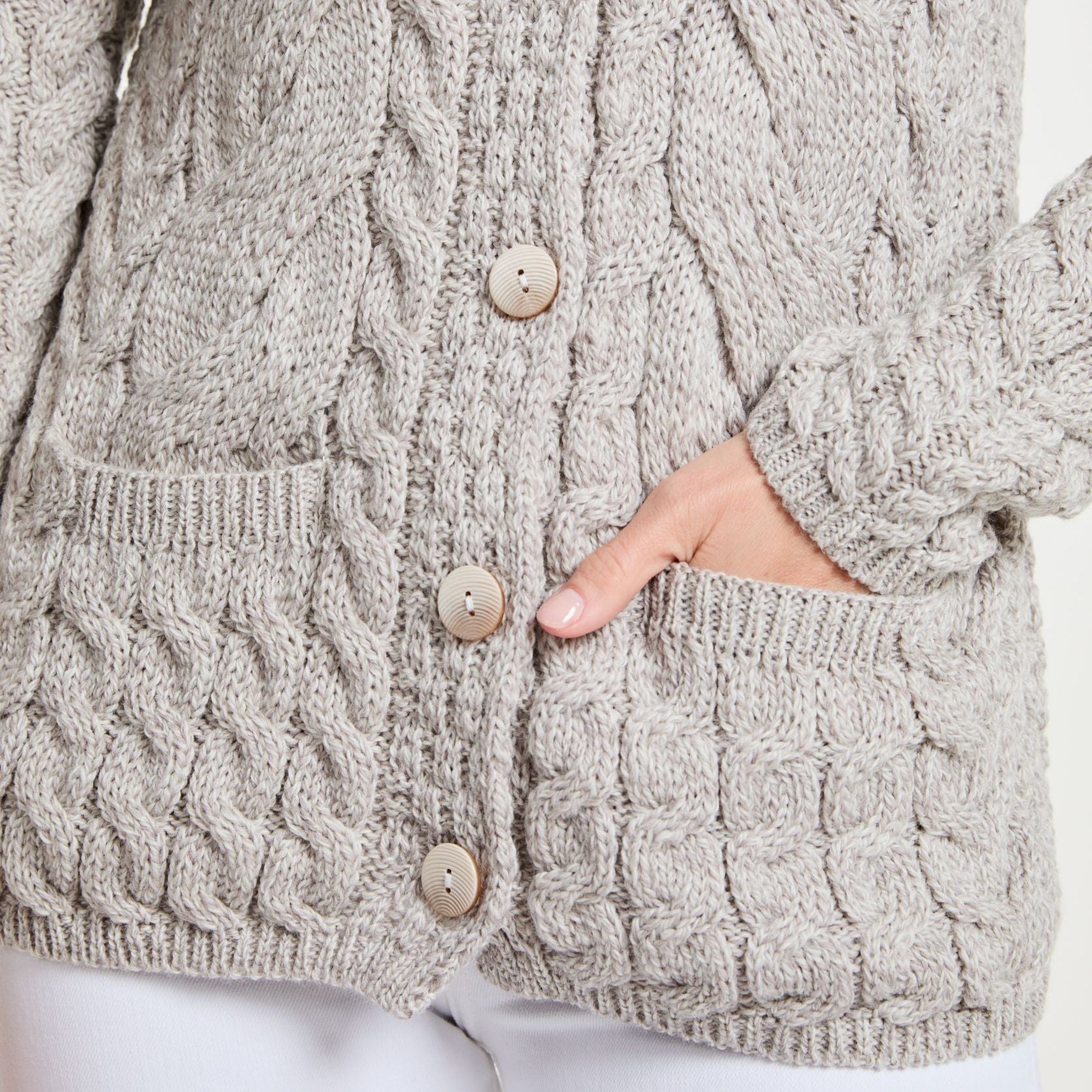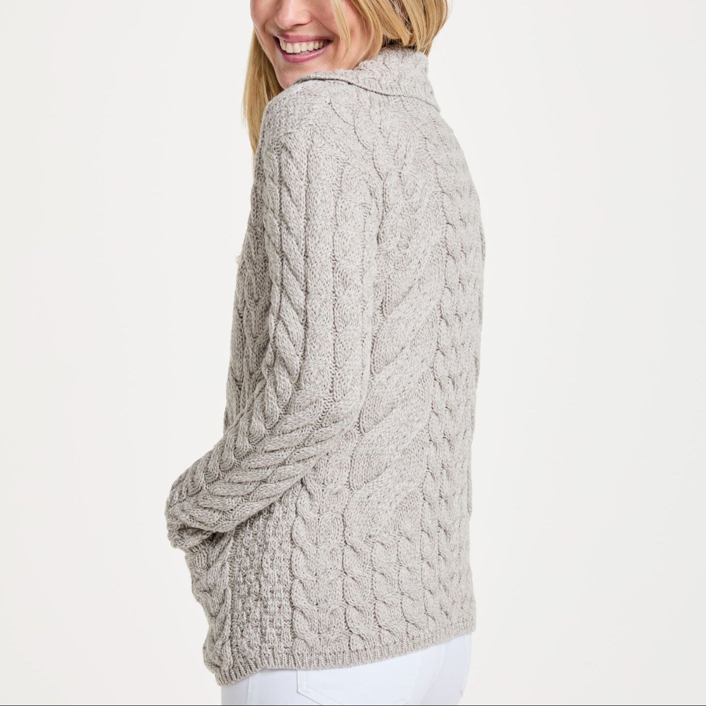 The Belcarra Aran Cardigan is a magnificent nod to Aran tradition, yet captures a contemporary flare that Aran knitwear hasn’t quite seen before. We absolutely adore the modern take on traditional stitching, to include chunky four finger and rope cables and a beautiful moss stitch button stand. Crafted with Supersoft Merino wool, with practical and perfectly crafted pockets, you’ll feel comfortable, cosy and confident in this knit.