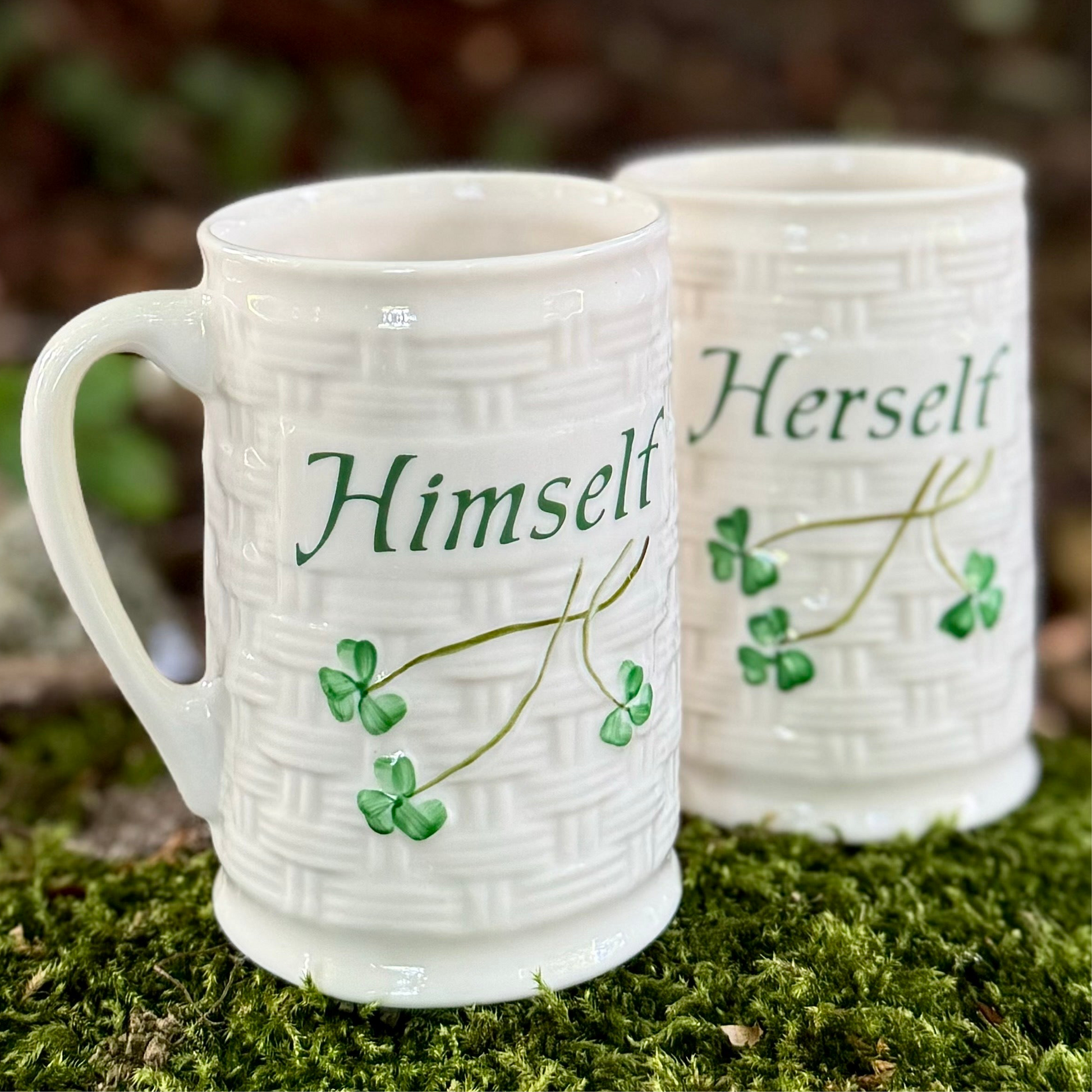 The ideal Irish gift, Belleek's Classic Himself & Herself Shamrock Mug Set from renowned Irish pottery makers is perfect for weddings or home gifting. Featuring a hand-painted inscription, this Irish mug set exudes elegance. Adorned with hand-painted shamrocks and a basket weave design, this exquisite piece of Irish china ensures the ultimate cup of tea, blending tradition and style seamlessly.