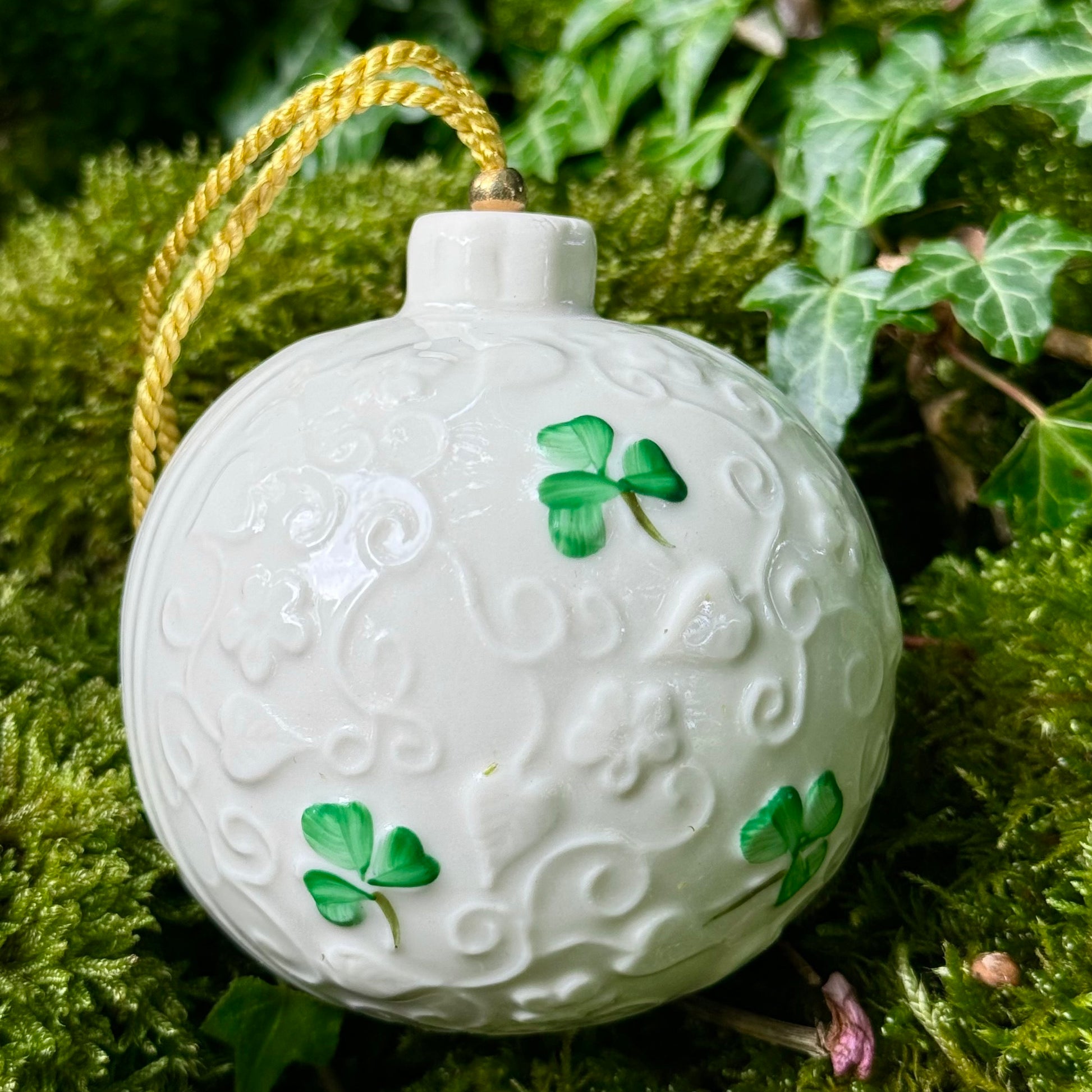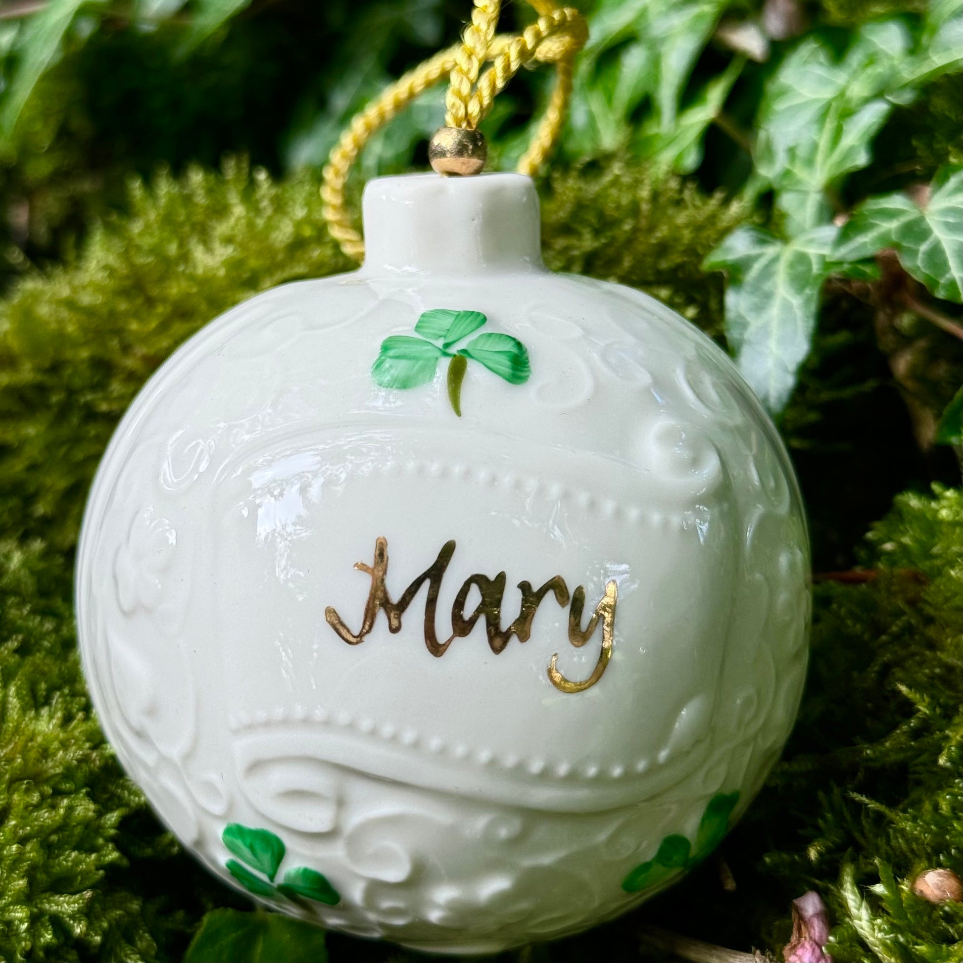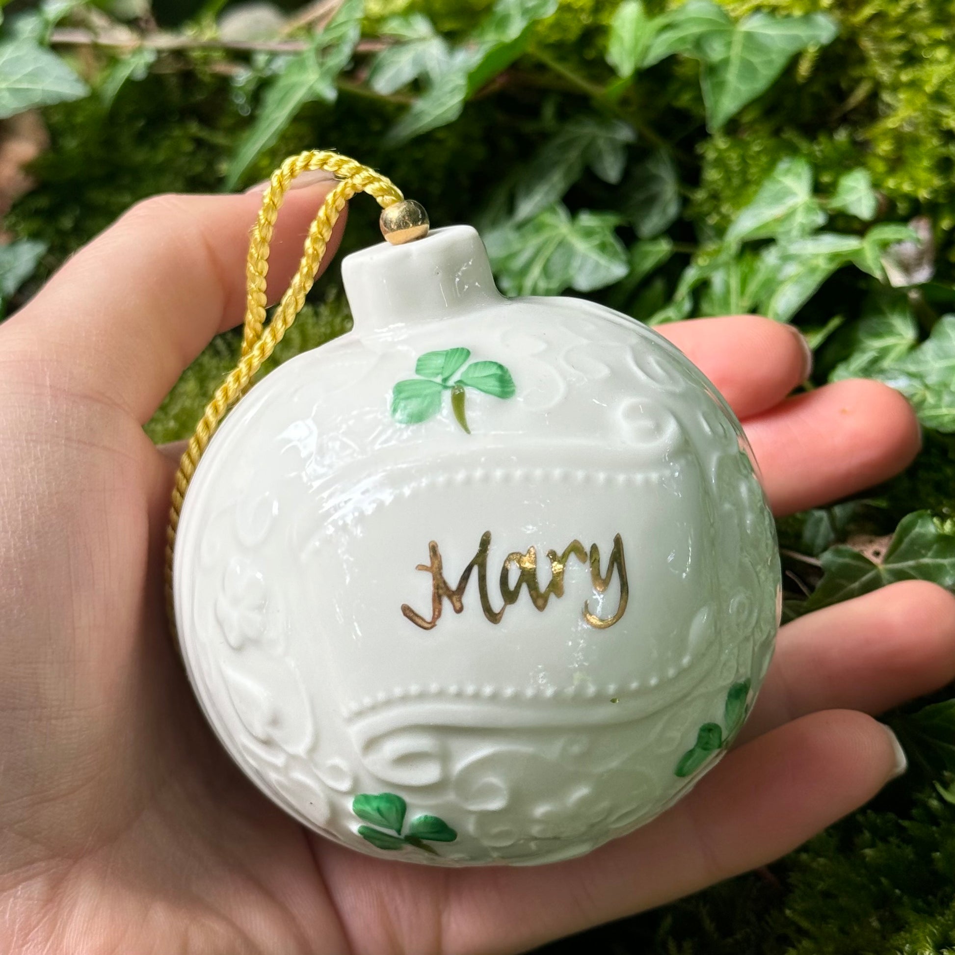 A Christmas ornament that is uniquely Irish. Made in Ireland, this bauble is an ideal gift for the home to decorate a Christmas tree with. You can request for the chosen name to be painted onto the bauble to make it an all the more special Irish gift. Made to order so please wait about a week before it's shipped.