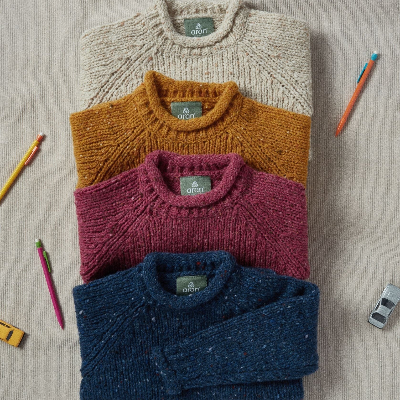 Nothing says comfort like an easy-going raglan sleeve and the Brackloon Óg Children’s Roll Neck Raglan Crew brings comfort in abundance. With fully linked sleeves and a rolled neck, cuffs and hem, there’s a casual and earthy finish to this piece, making it the perfect choice for your nature loving little one! We absolutely love how the plain knit elevates the quality of the lofty yarn and how undeniably cool it looks worn oversized.
