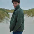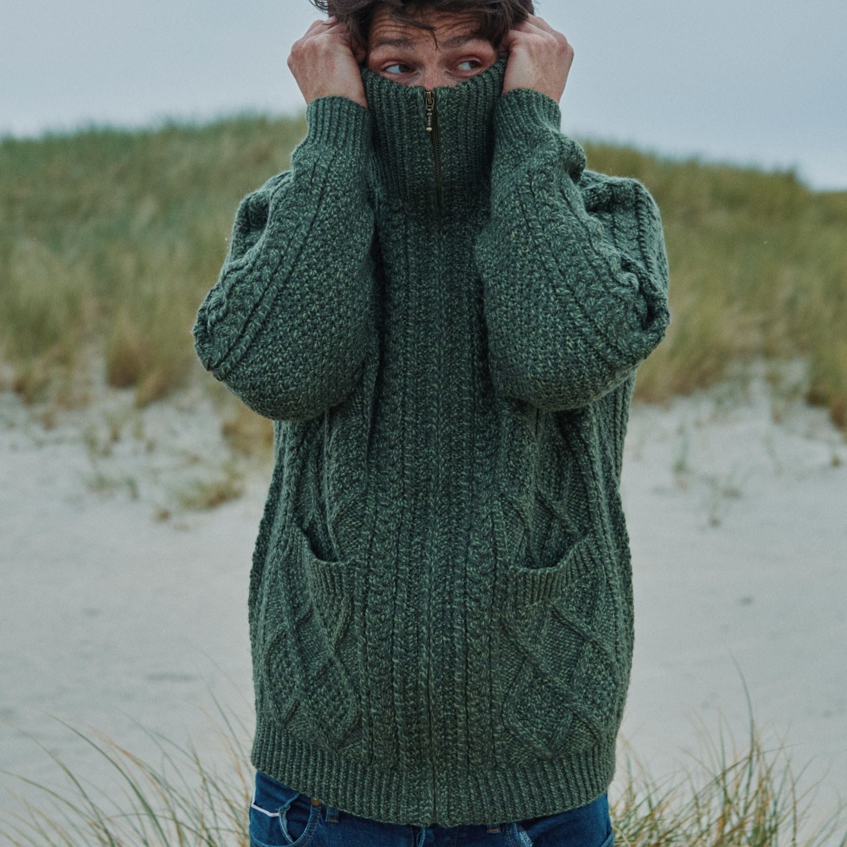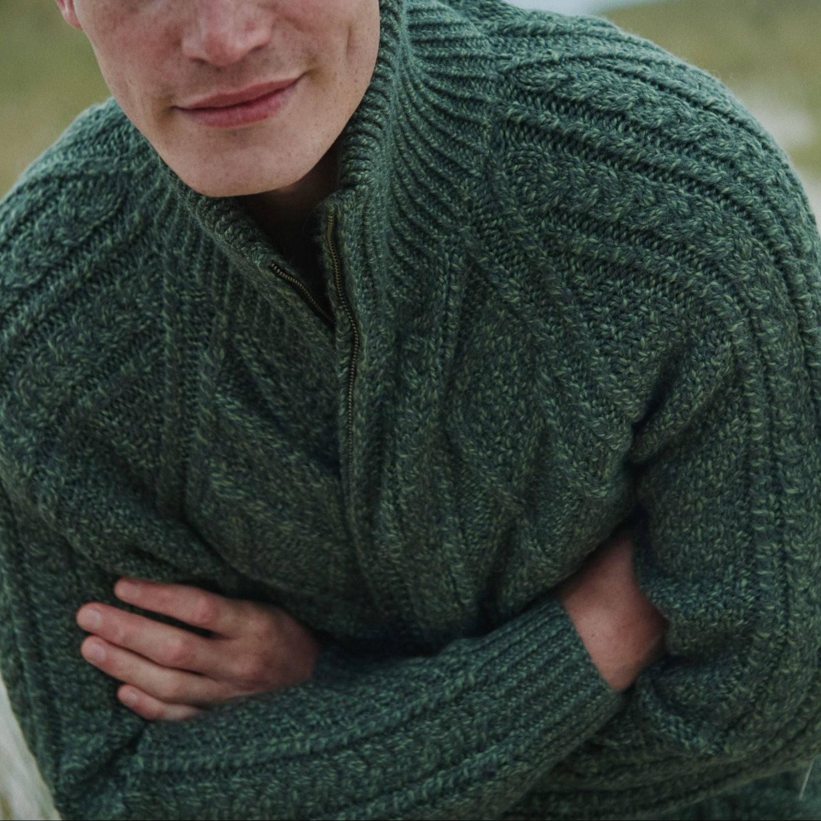 The Brannock Men’s Aran Zipper Cardigan has been designed with a plethora of Irish adventures in mind. With its cosy, stand-up collar and the practical addition of two patch pockets, it really is the perfect partner for a hike, some sightseeing or a cold evening by the fire.
