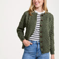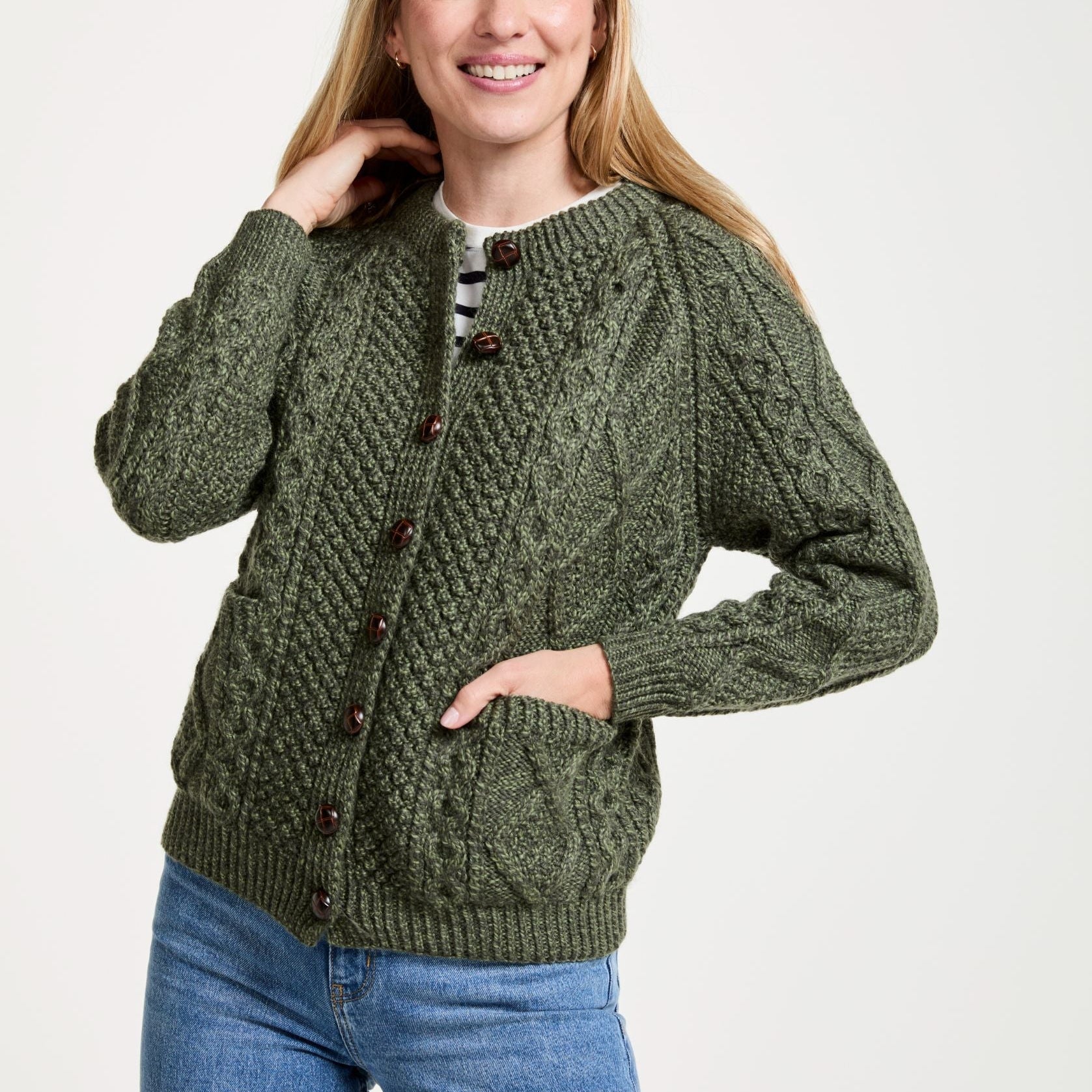 Embrace the timeless elegance and cozy warmth of the Breaffy Ladies Aran Cardigan. Expertly crafted by Aran Woollen Mills, this cardigan seamlessly blends traditional Irish design with modern sophistication, making it a versatile addition to any wardrobe.