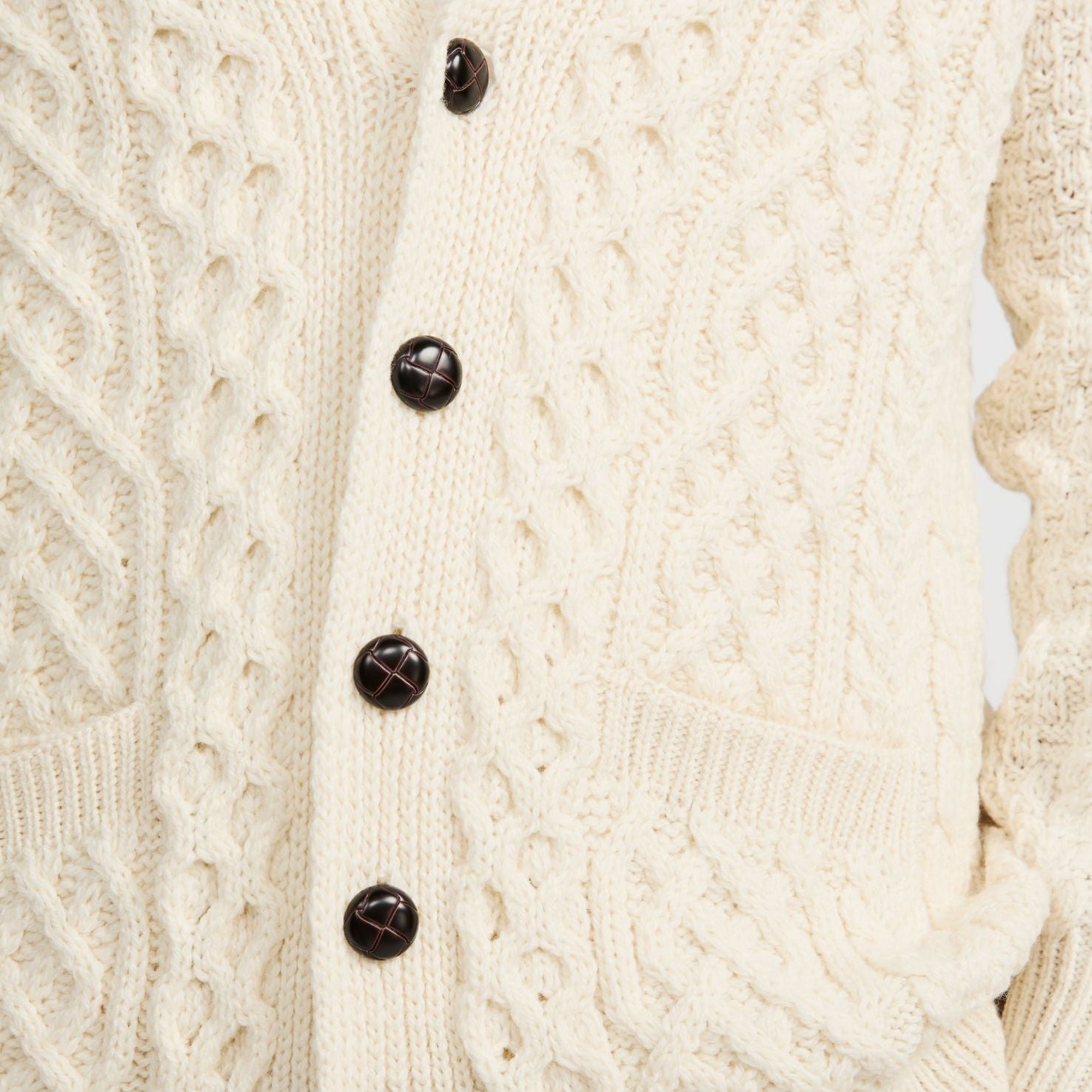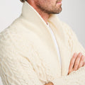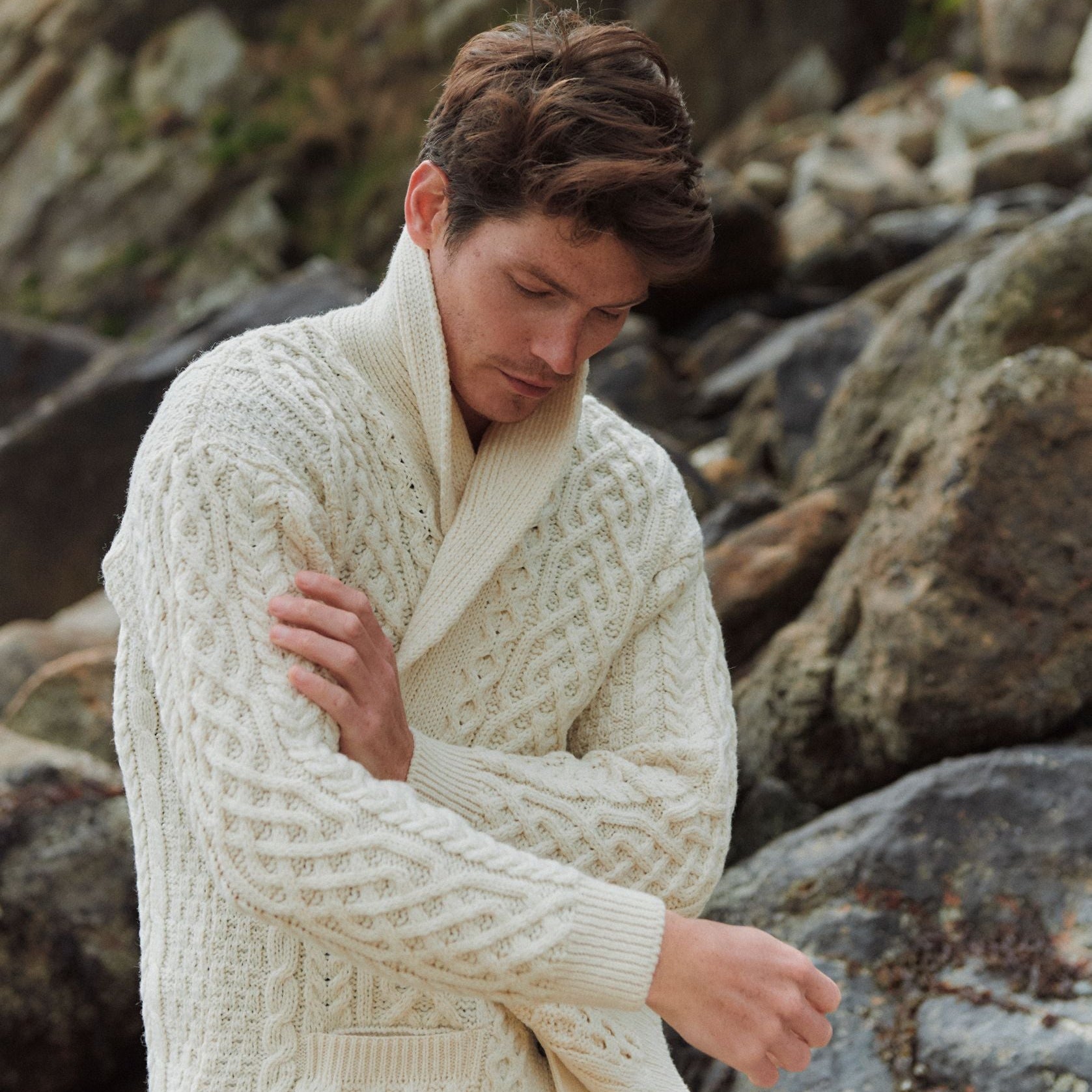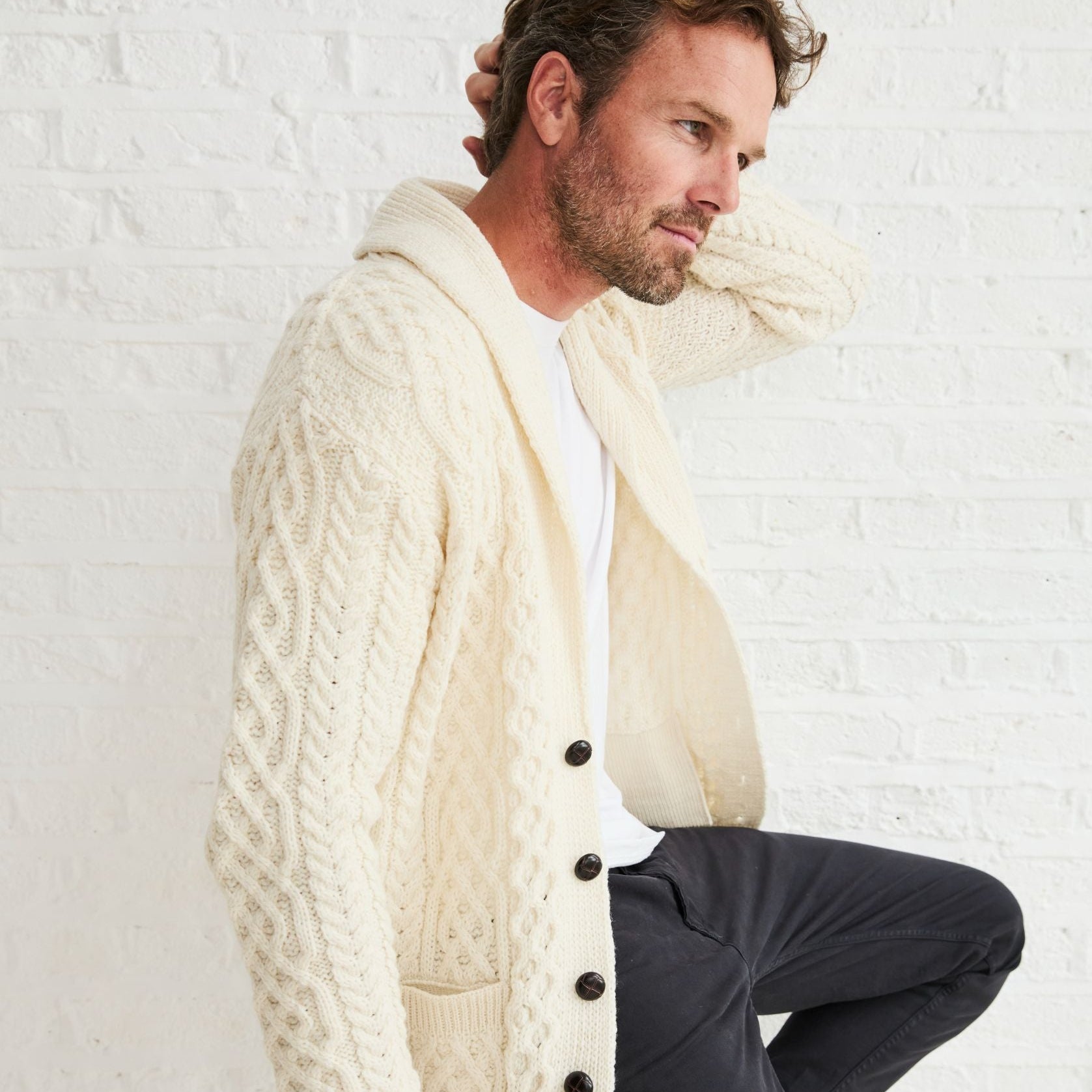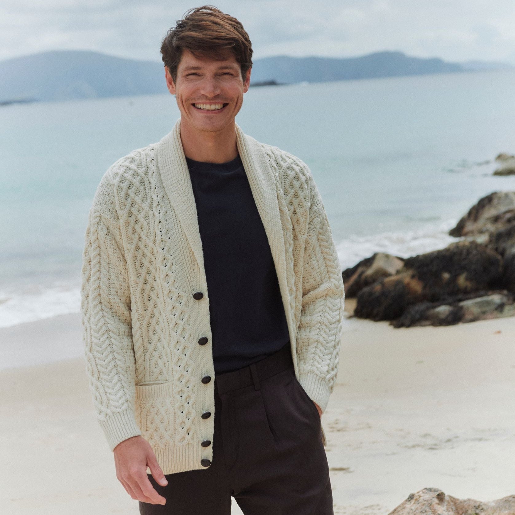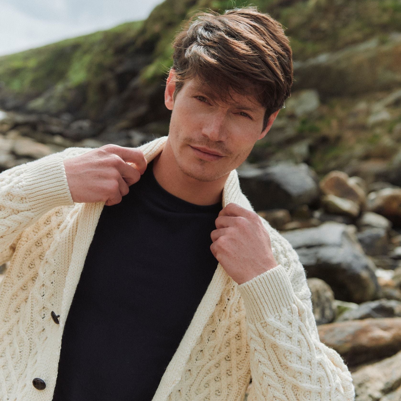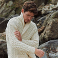 The Carlingford Men's Shawl Neck Aran Cardigan is the perfect balance of structured masculinity and Aran warmth.