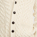 In this piece, we see traditional Aran stitching celebrated with honeycomb, trellis, cable and moss stitching brought together in perfect harmony. With 6 traditional Aran football buttons at the centre front, and two practical pockets, this piece is the perfect companion for outdoor adventures or time spent relaxing.