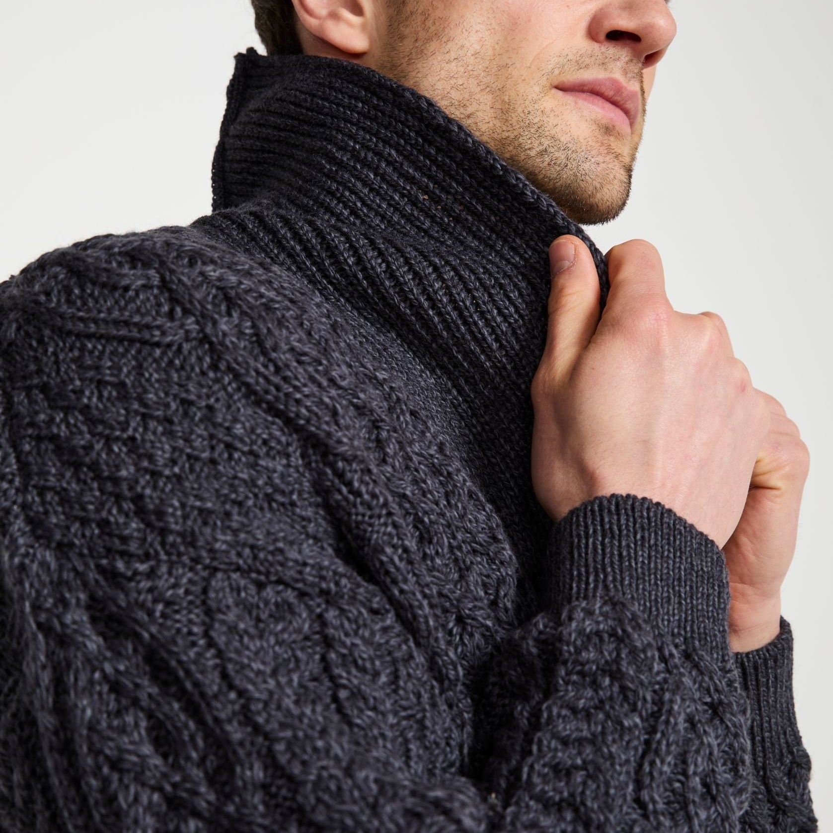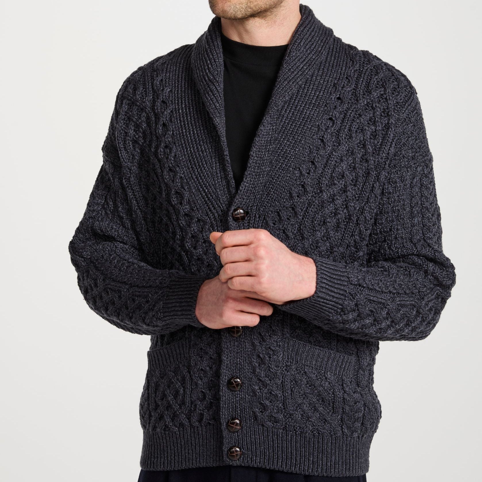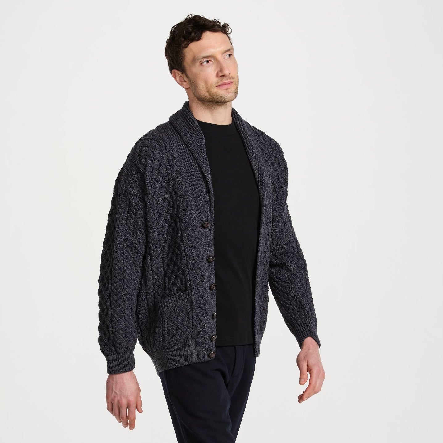 The Carlingford Men's Shawl Neck Aran Cardigan is the perfect balance of structured masculinity and Aran warmth.