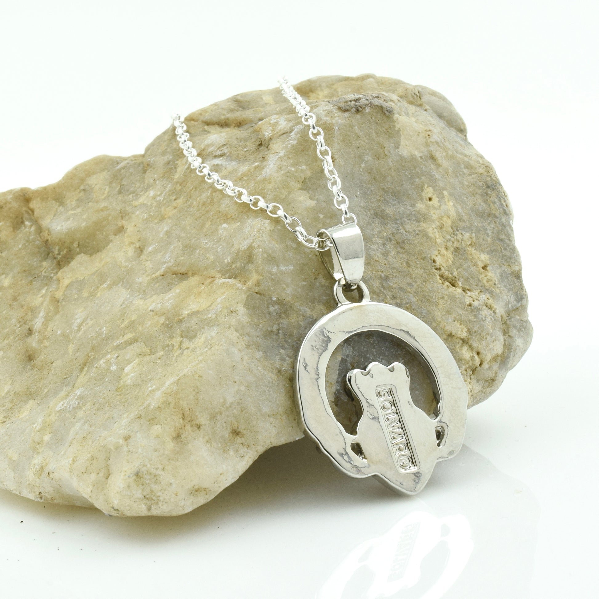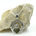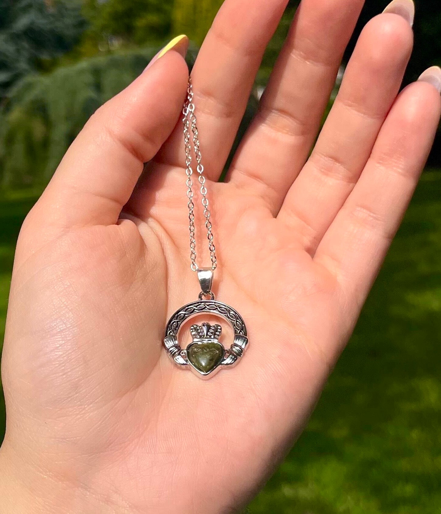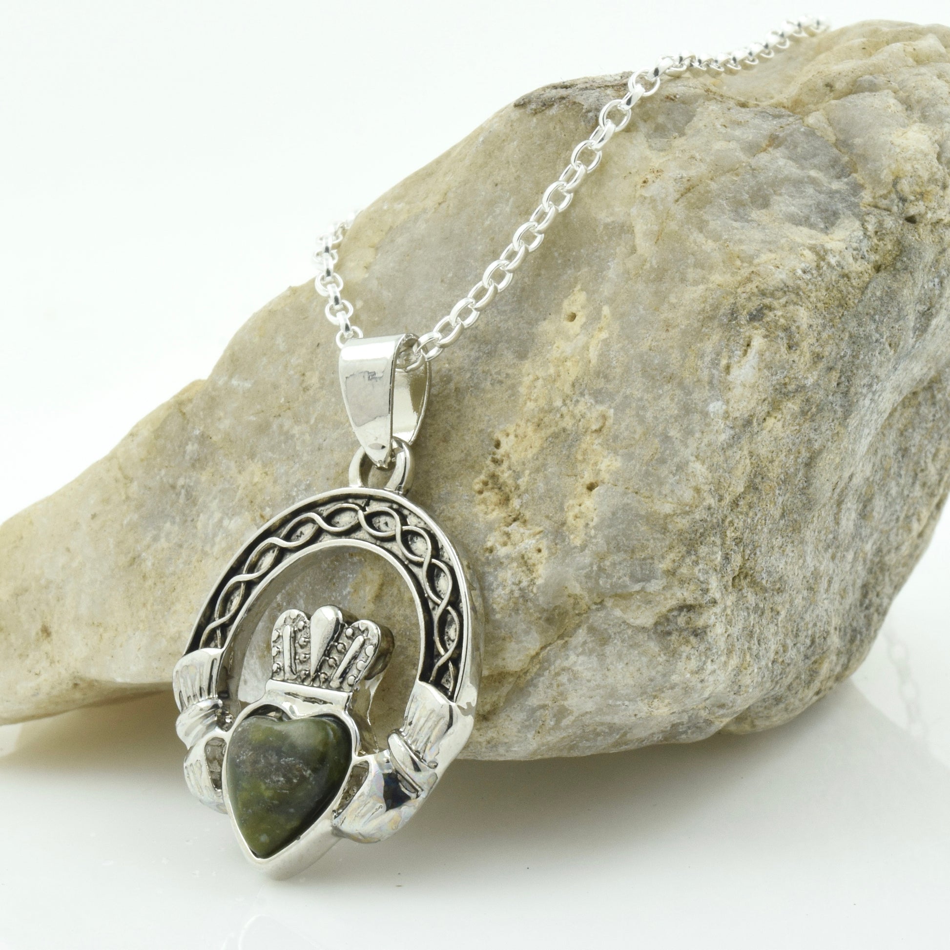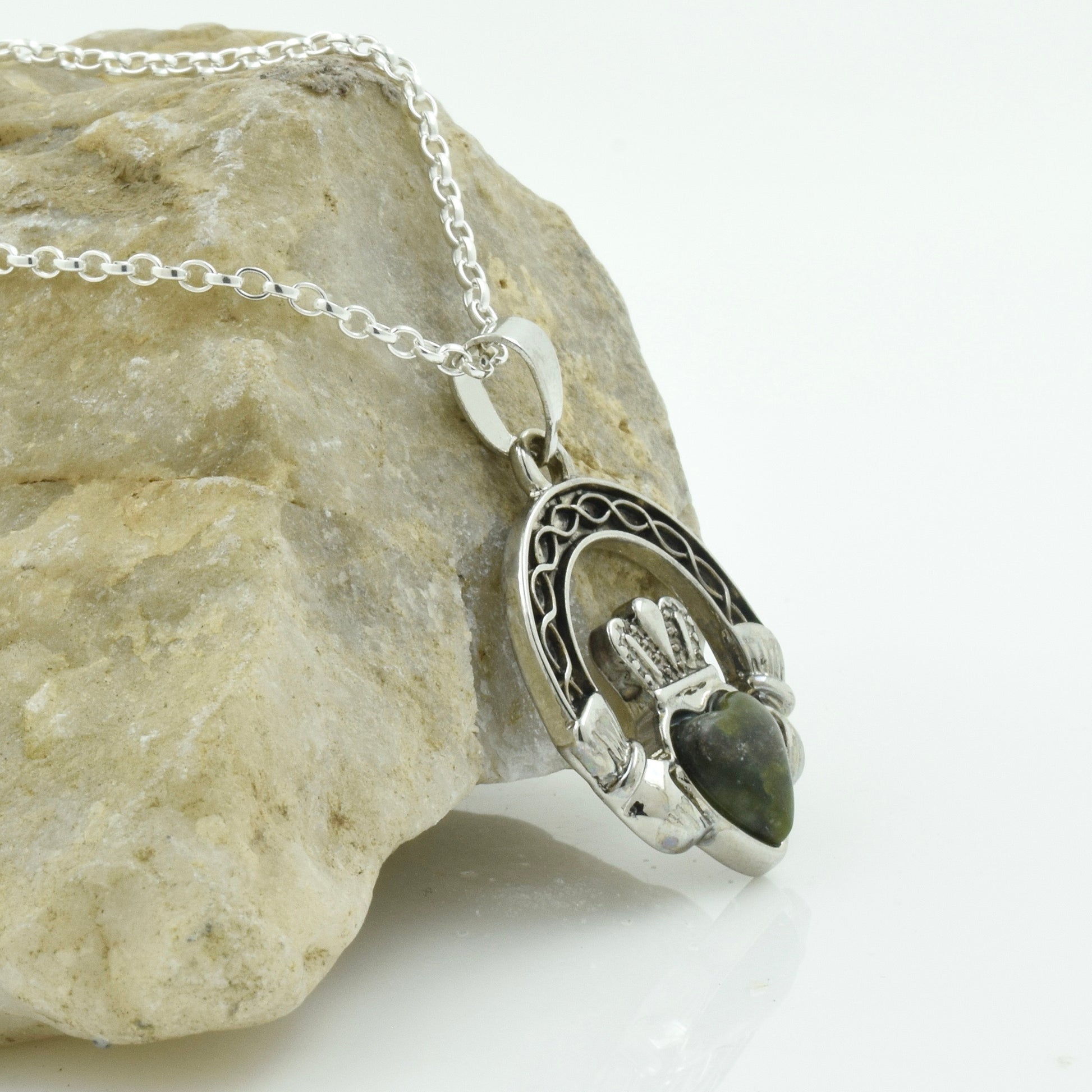 A precious rhodium plated Claddagh pendant crafted in iconic Connemara marble. This Irish marble gemstone is a unique stone that dates back to ancient times and is known as “Ireland’s gemstone”.