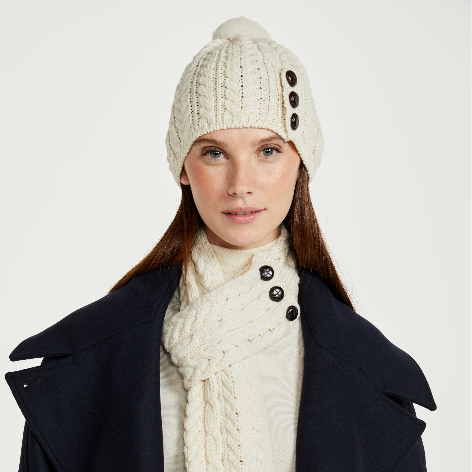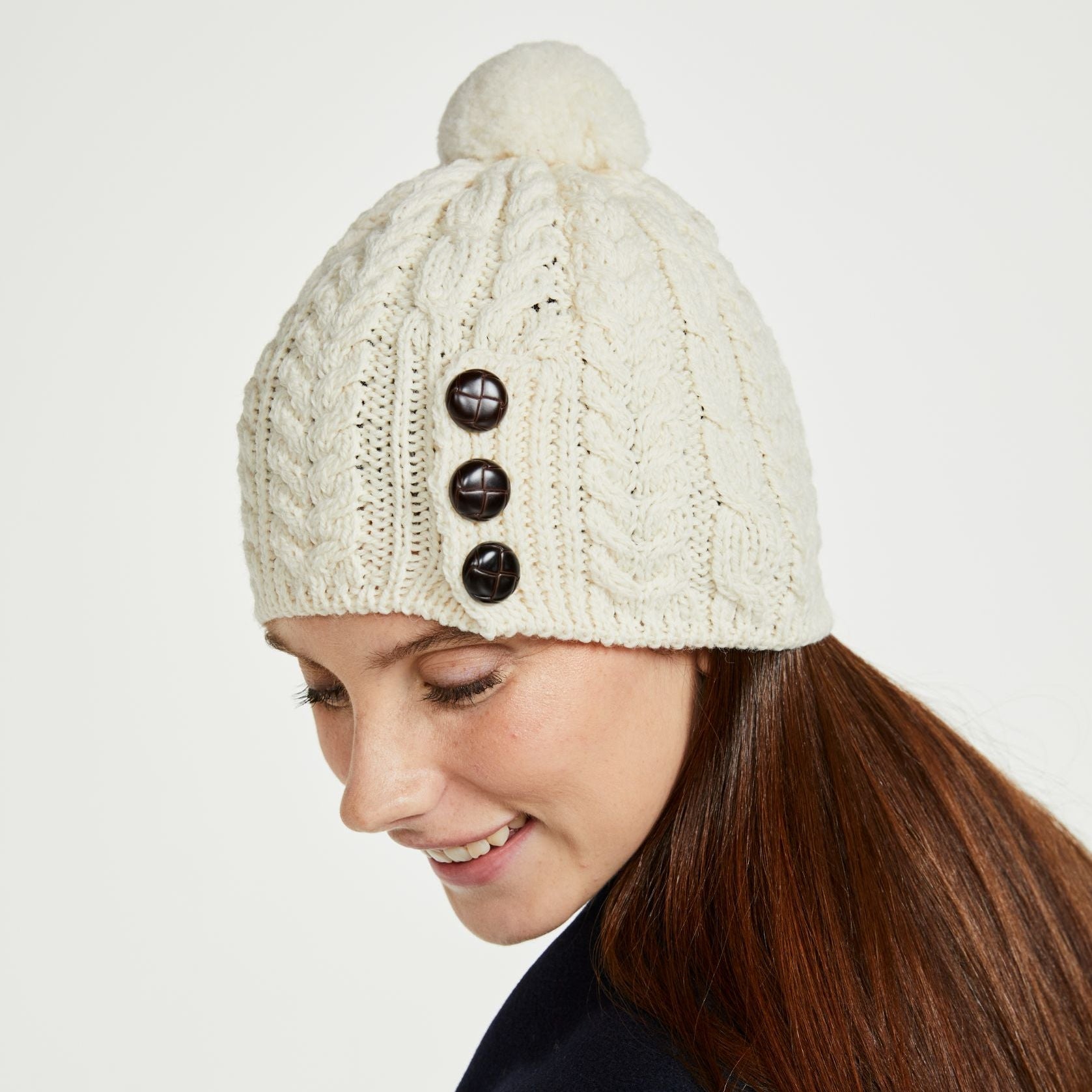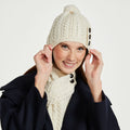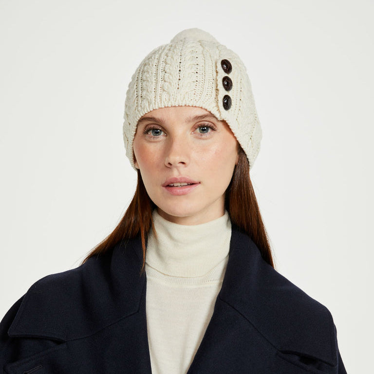 The Cong Aran Merino Cream Hat with Pom Pom brings together classic Irish knitwear and everyday practicality. Made from 100% Merino wool, it offers natural warmth while remaining soft and breathable against the skin. The detailed Aran cable stitching reflects generations of Irish knitting tradition, adding depth and texture to the design. Three decorative Aran-style buttons provide a subtle heritage touch, while the matching pom pom gives the hat a relaxed, easy-going finish. The cream tone keeps it versatile, pairing effortlessly with winter coats and knitwear.