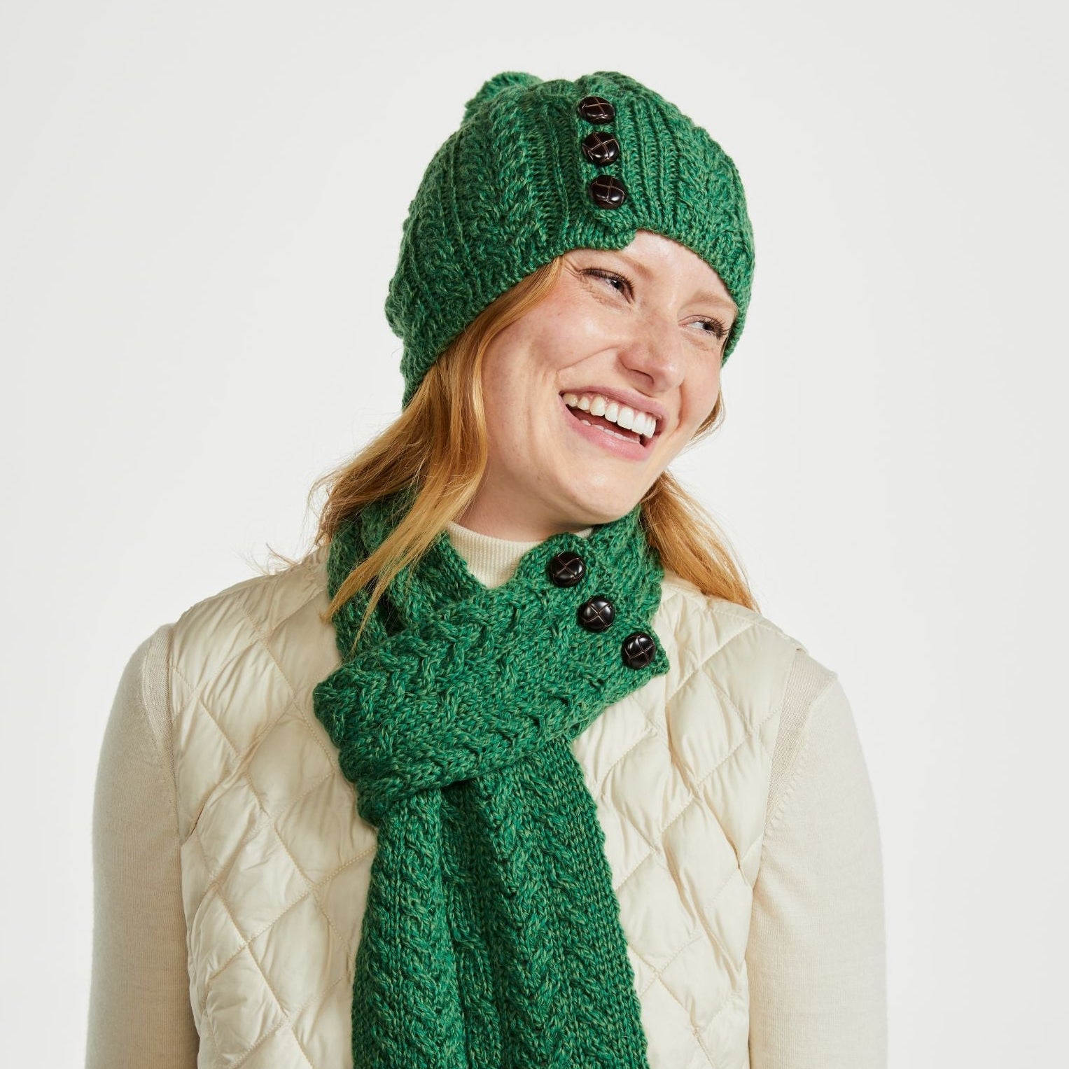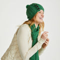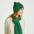 The Cong Aran Merino Green Hat with Pom Pom brings together classic Irish knitwear and everyday practicality. Made from 100% Merino wool, it offers natural warmth while remaining soft and breathable against the skin. The detailed Aran cable stitching reflects generations of Irish knitting tradition, adding depth and texture to the design. Three decorative Aran-style buttons provide a subtle heritage touch, while the matching pom pom gives the hat a relaxed, easy-going finish. The green tone keeps it versatile, pairing effortlessly with winter coats and knitwear.