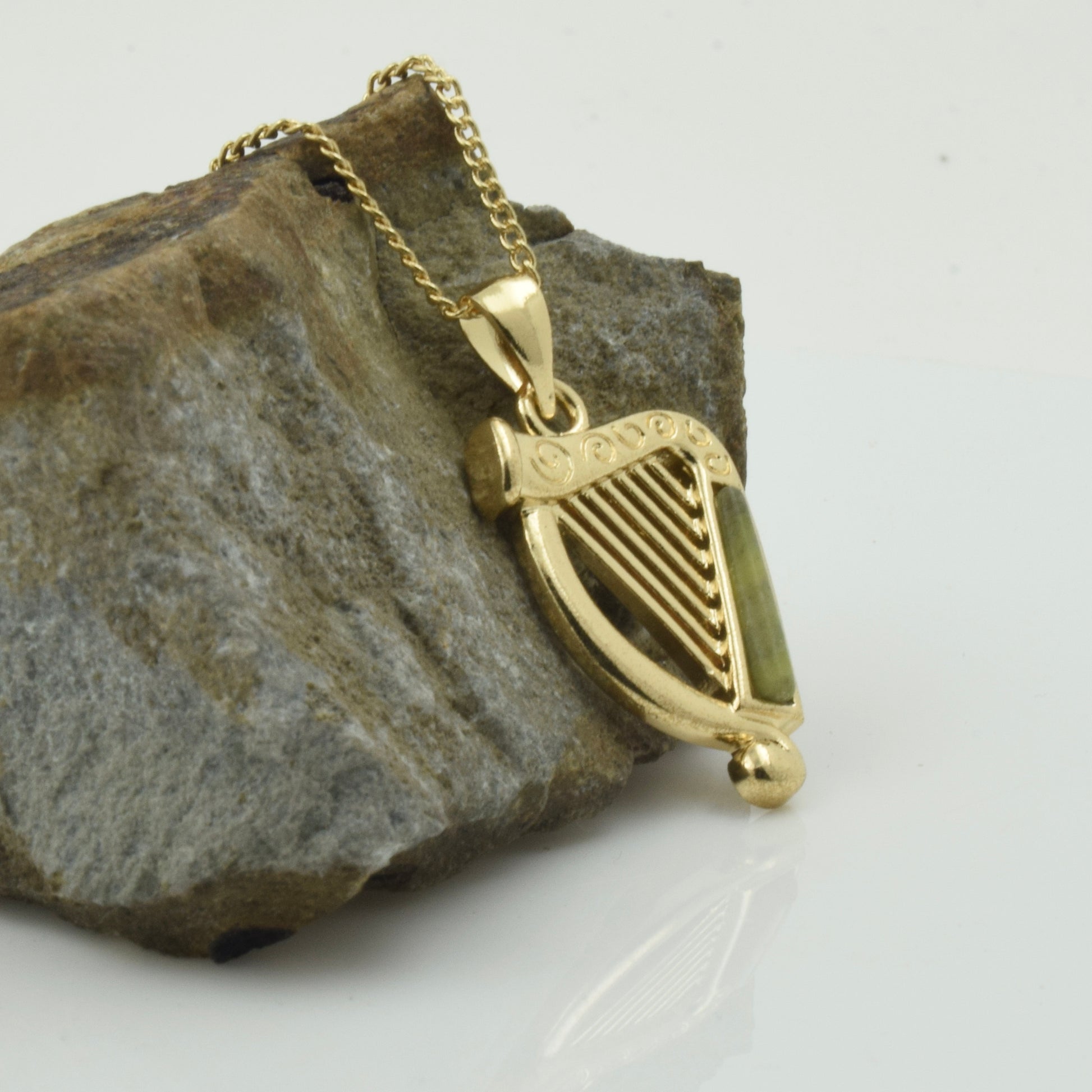 - Exquisite harp pendant intricately designed with Connemara Marble