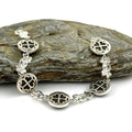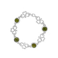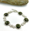 This distinctive bracelet comprises of five perfectly proportioned circular Connemara Marble stones encased in silvertone rails and separated with silvertone Shamrock motifs.