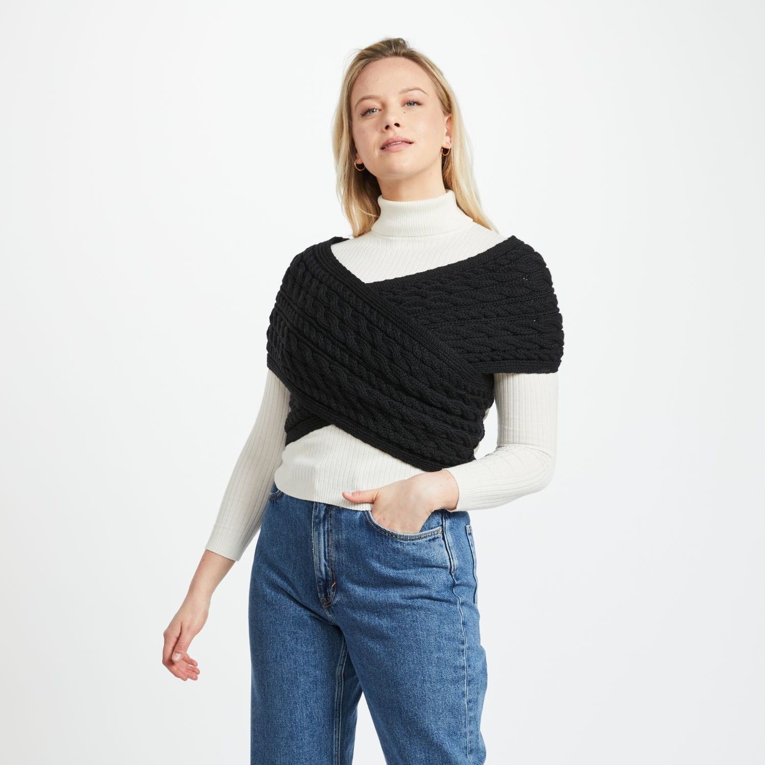 Elevate your wardrobe with the timeless elegance and versatility of the Corrib Black Crossover Aran Wrap. Whether worn for warmth on chilly evenings or to add a touch of sophistication to your ensemble, this wrap is sure to become a cherished staple in your collection.