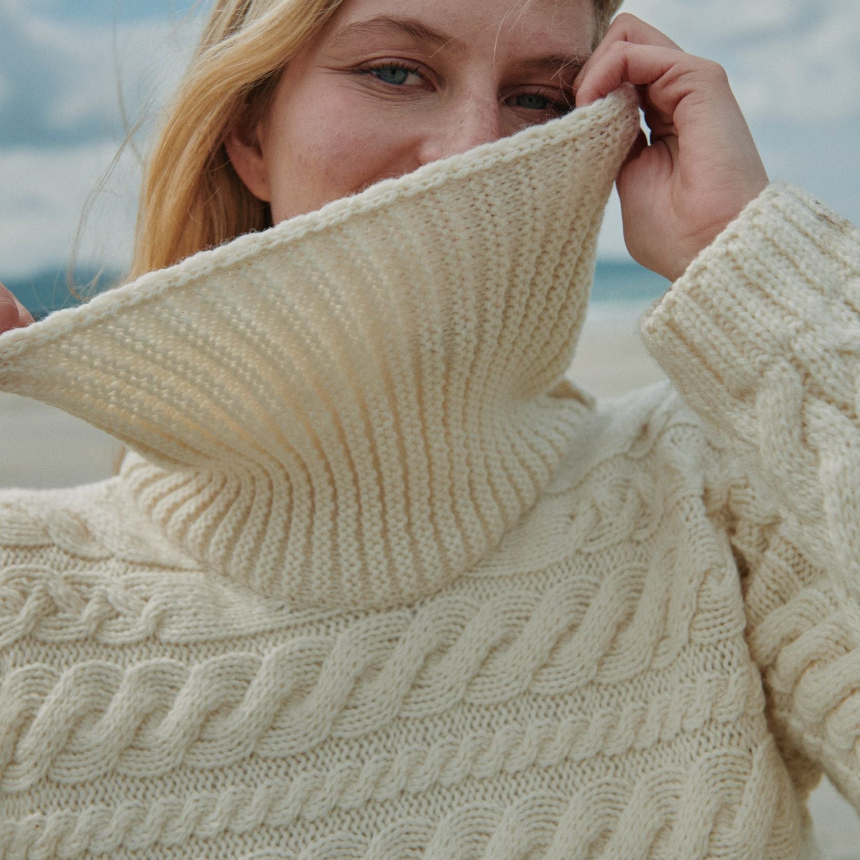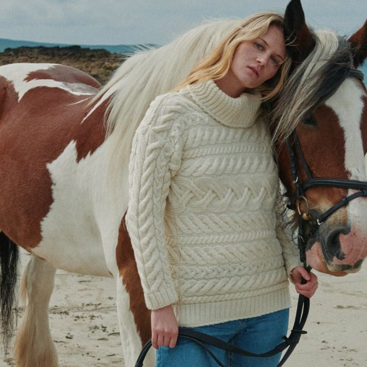 This standout piece is crafted with our very own Supersoft Merino wool, allowing you the chance to own an authentic Aran sweater with the added comfort of a gentle wool on your skin. With a cosy, chunky cowl neck and bold horizontal stitching, the Derreen makes a statement while still maintaining the rich tradition of Aran knitting. You’ll find large basket and cable stitching on this beautiful knit, said to bring safety, good luck and abundance to the wearer.
