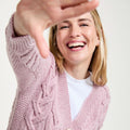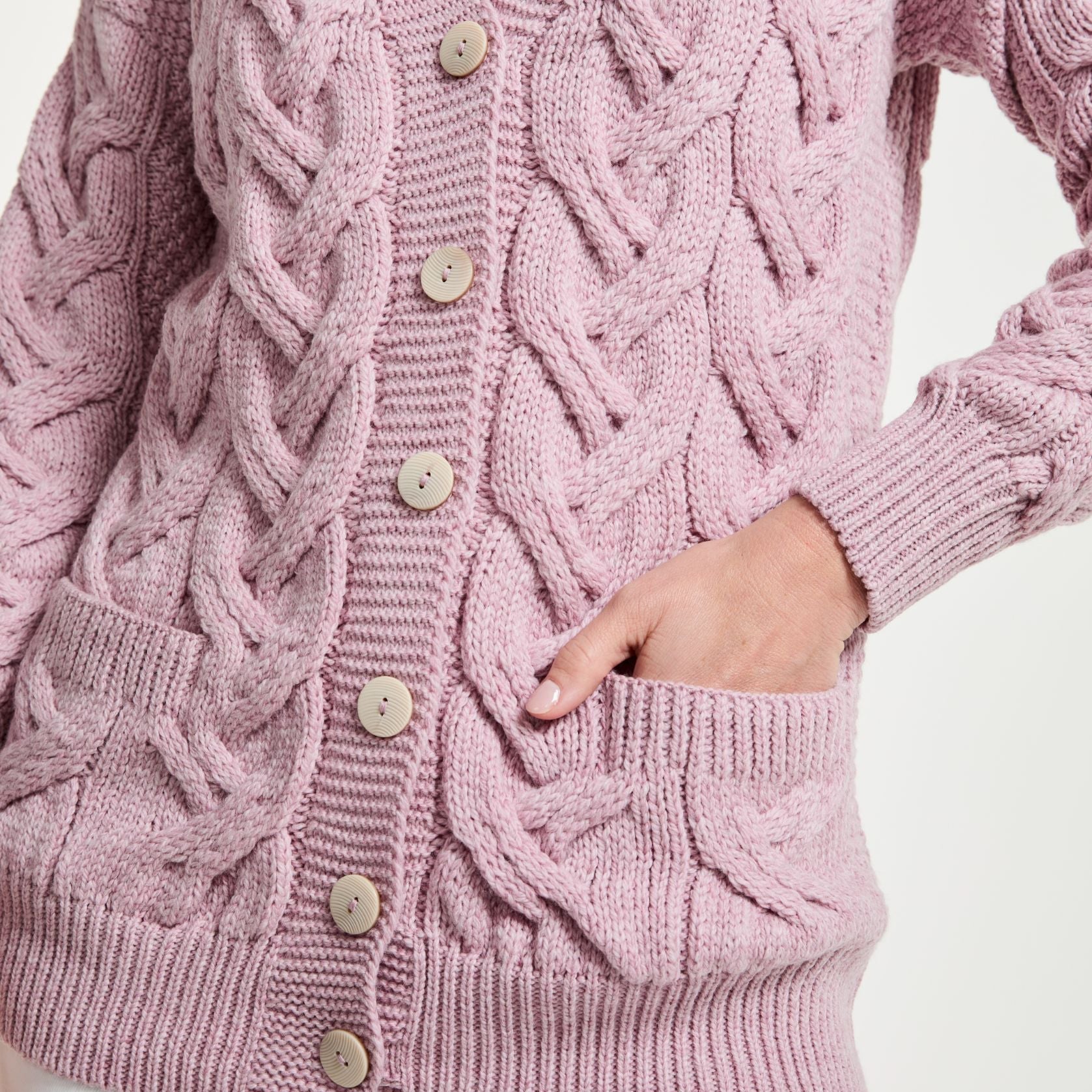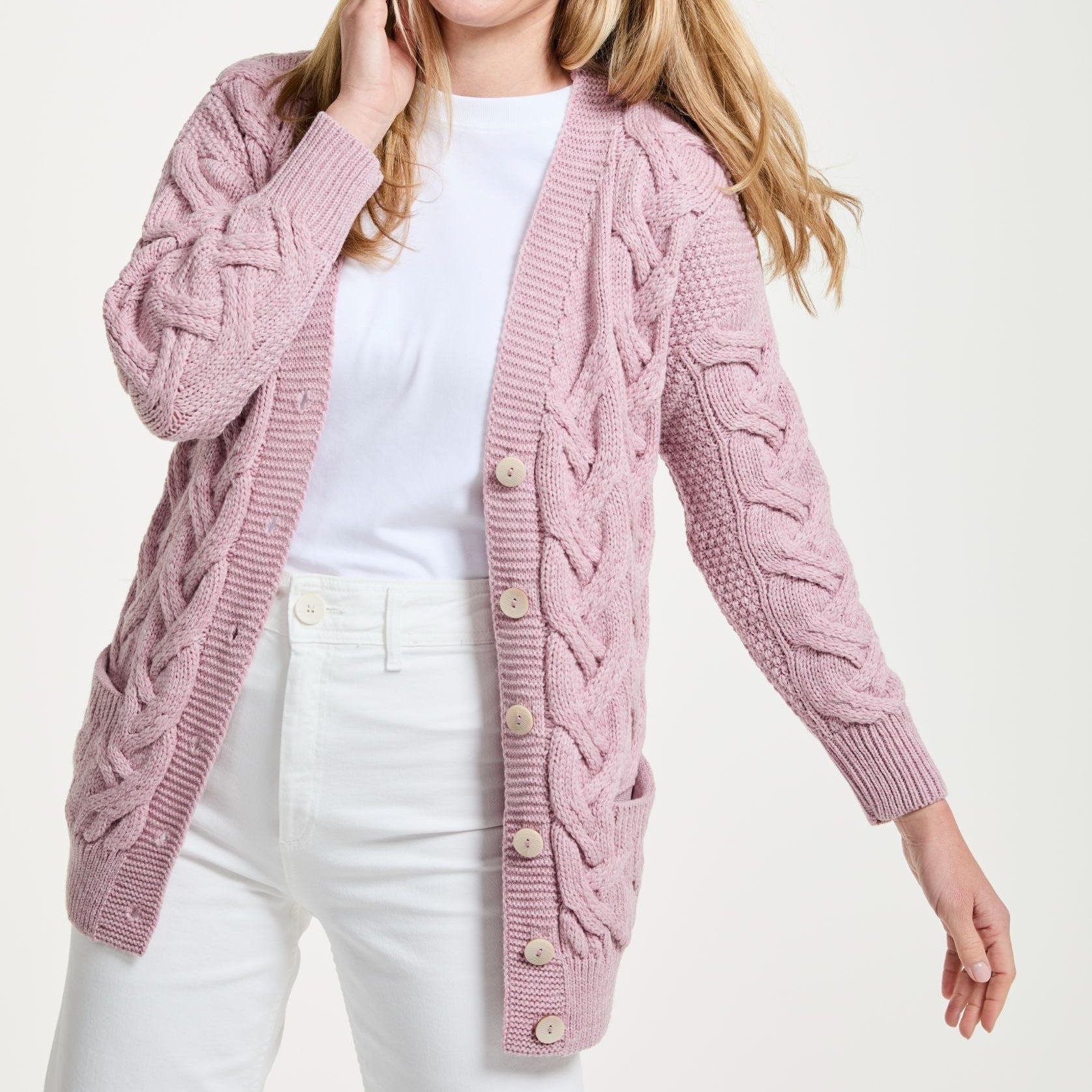 Knitted with Supersoft Merino Wool, the Downpatrick Aran Cardigan is a wonderful addition to your sustainable wardrobe. This deep v-neck knit features a contemporary two finger cable stitch, accompanied by two practical and comforting pockets. The cardigan boasts a dropped shoulder sleeve and has six buttons with a natural resin finish.
