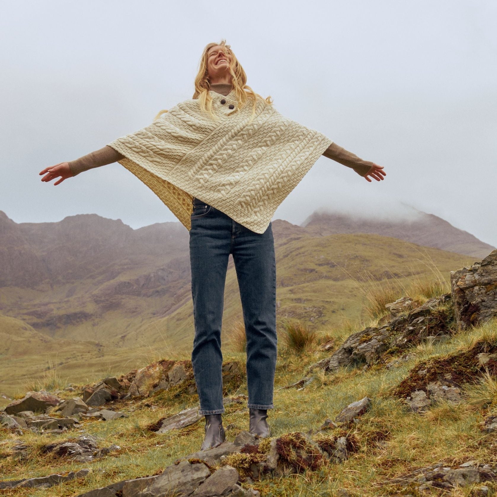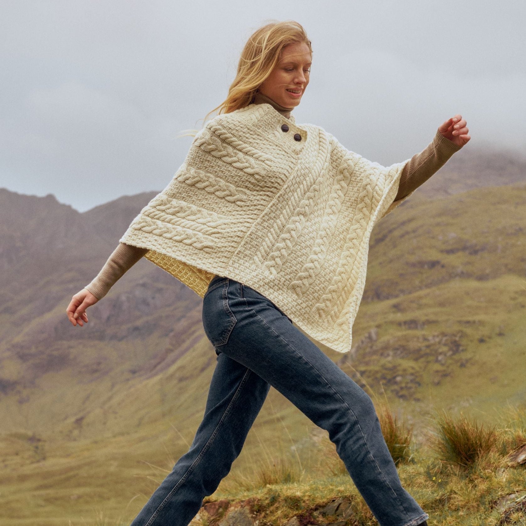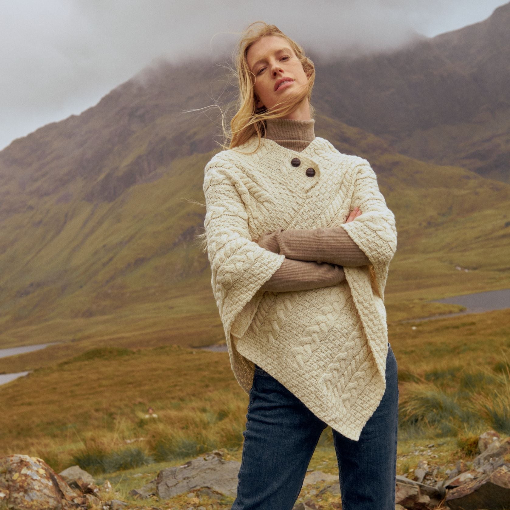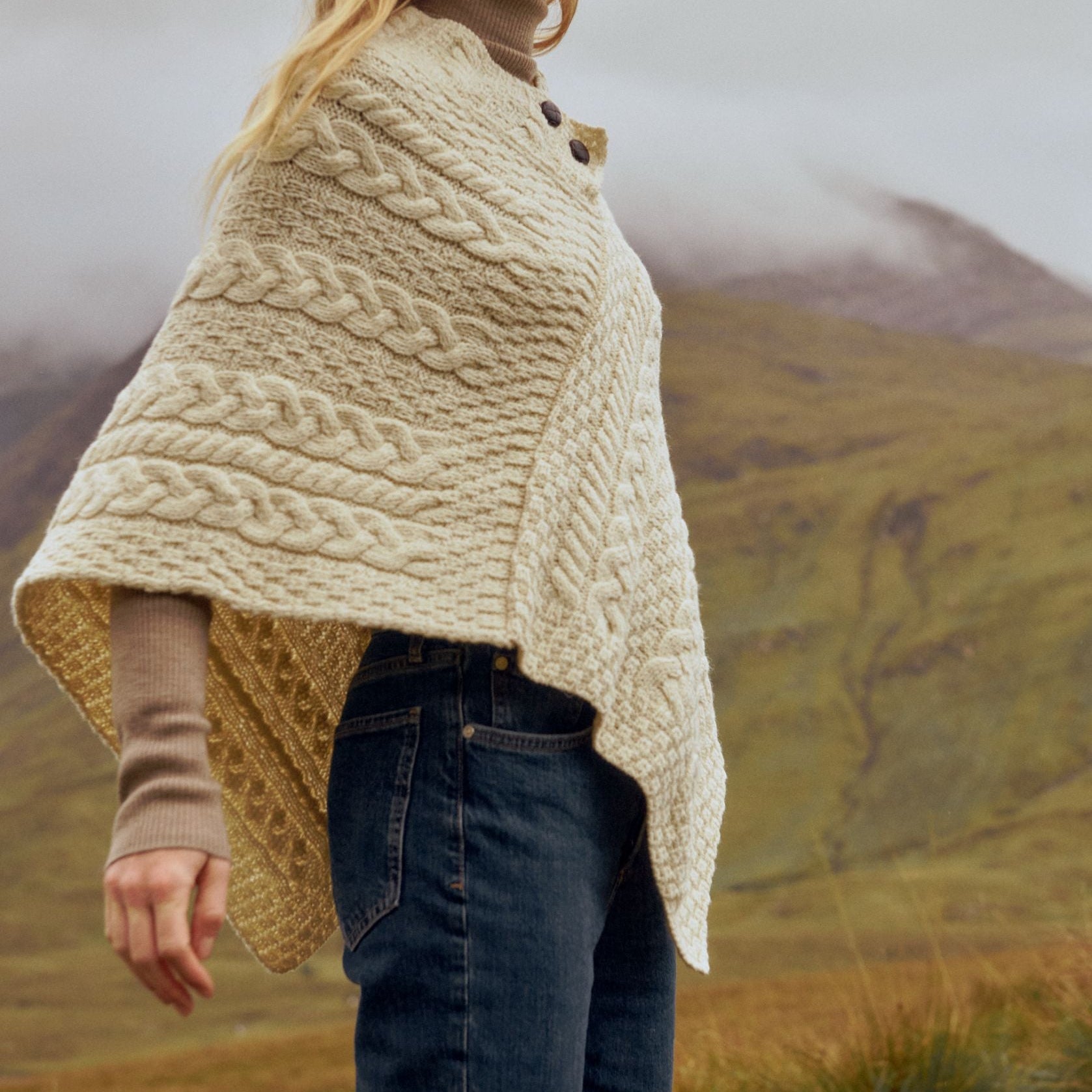 Easkey Ladies Classic Aran Button Natural Poncho
