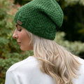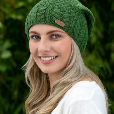 Knitted in an Aran Cable Floppy pattern in a Green colour with button down detail on the back made with 100% Wool with a Polyester fleece lining for extra warmth and comfort, ideal on a cold winter’s day. Soft to the touch and very warm and easy to wear.