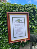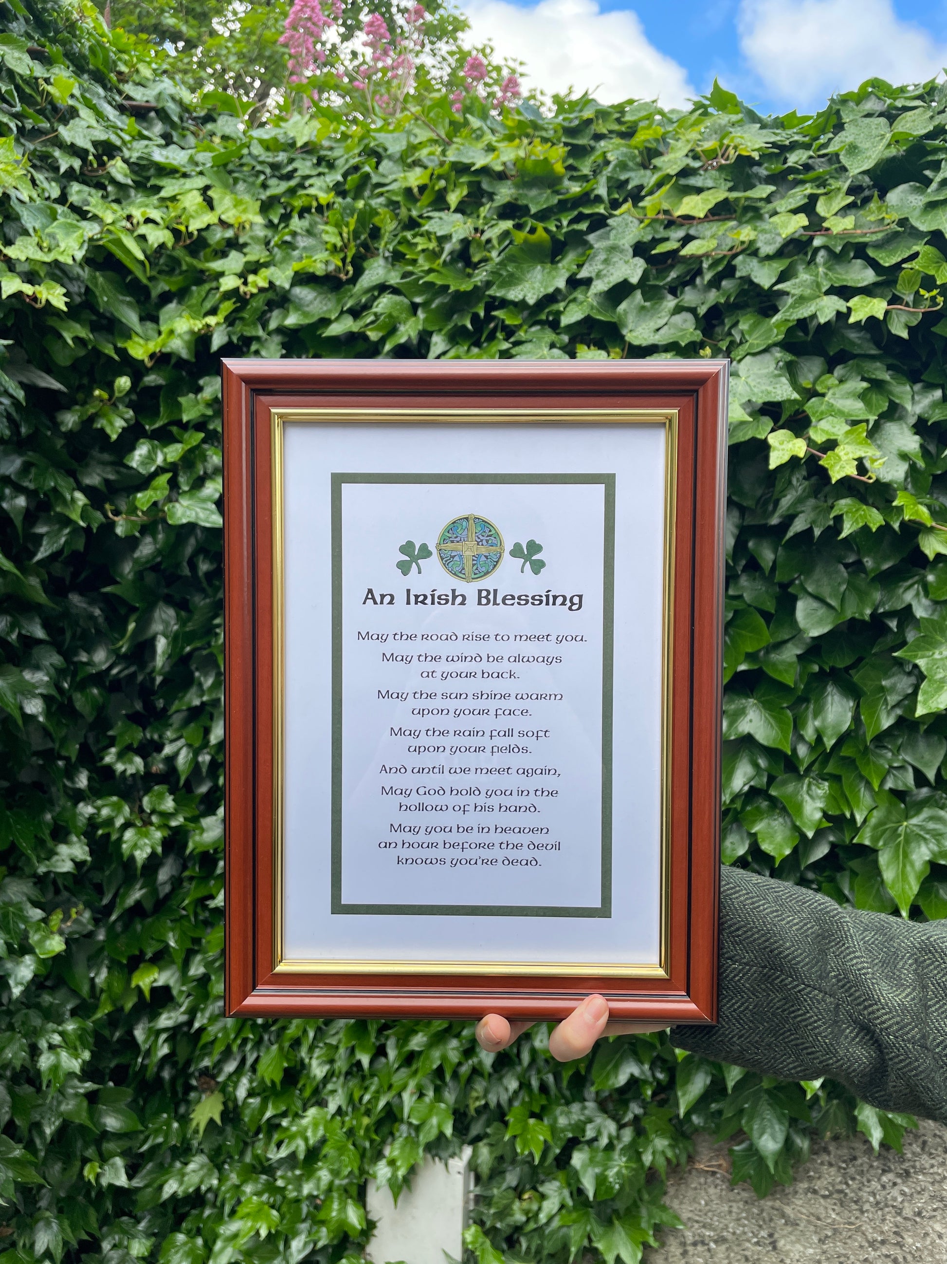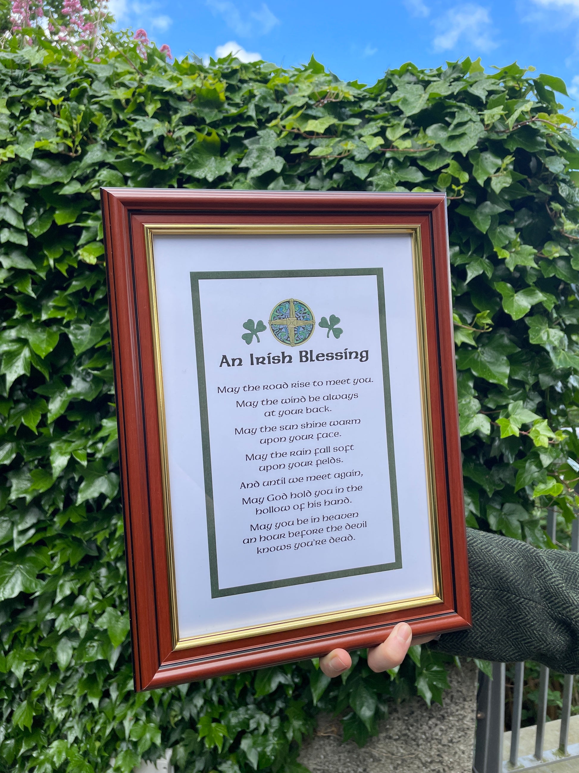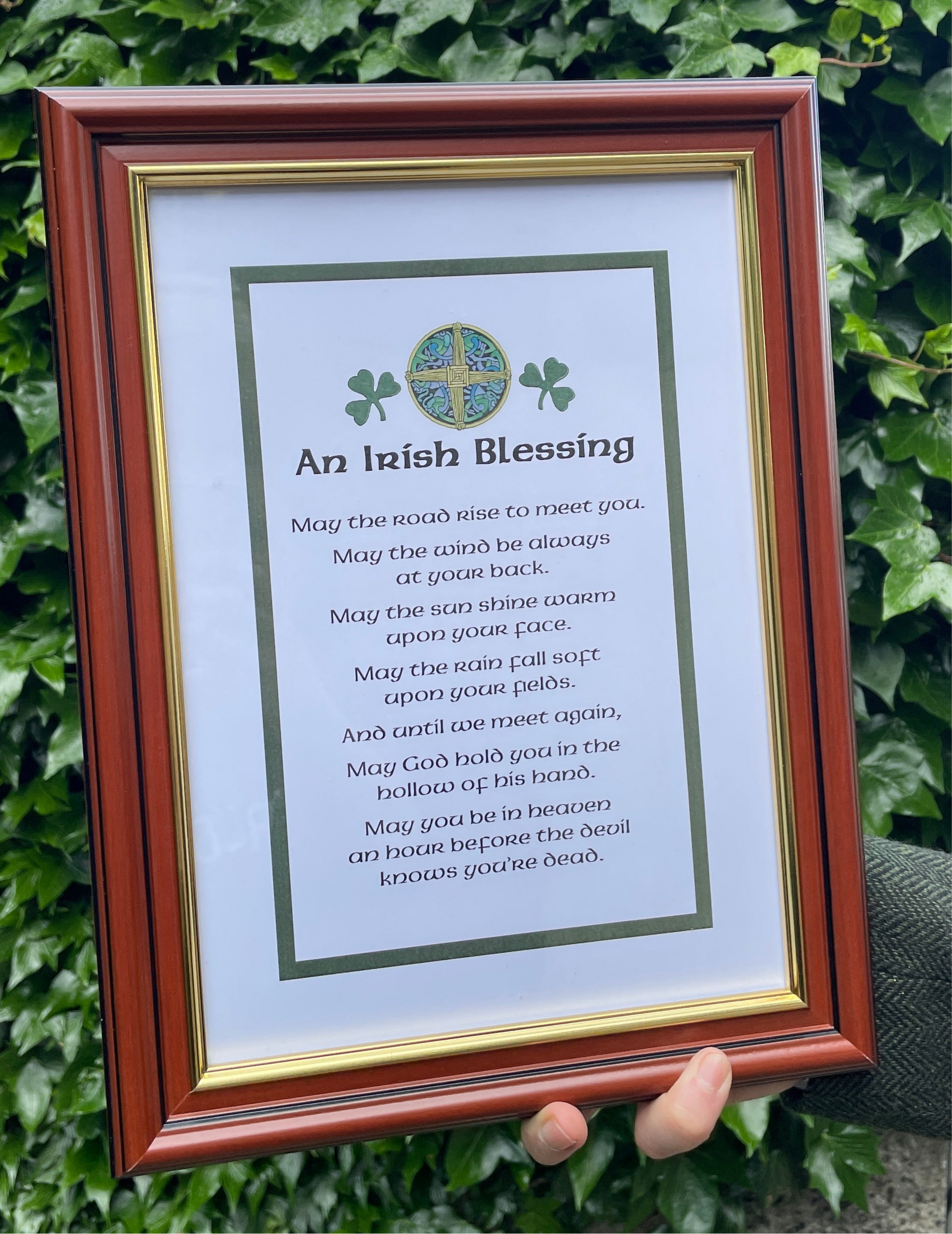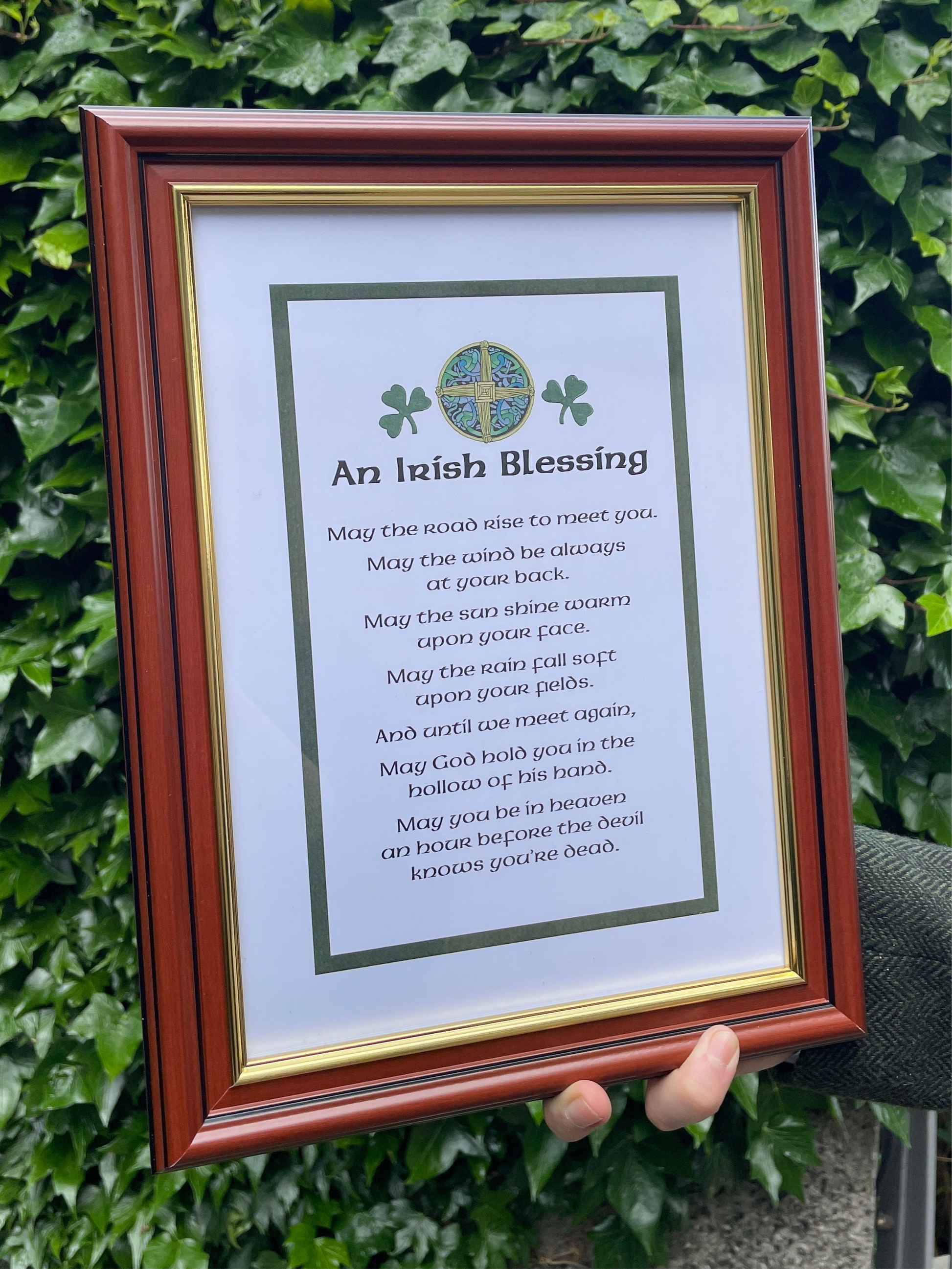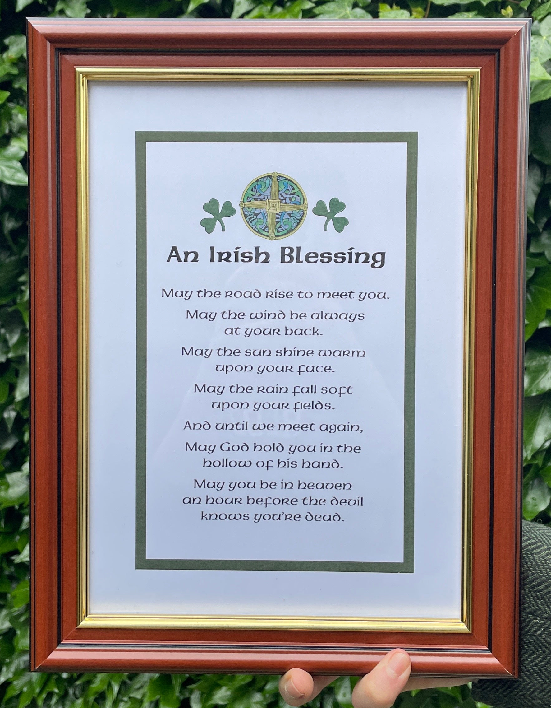 This much loved Irish prayer has stood the test of time and it's heartfelt words still strike a chord with Irish people to this day. In this framed Irish blessing, 2 lucky shamrocks sit on either side of St Brigid's cross, encircled by a Celtic knot motif. A thoughtful Irish housewarming gift.