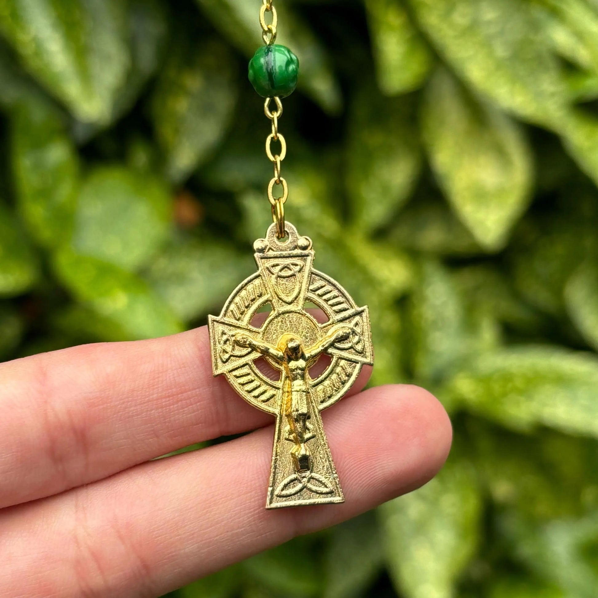 Gilt Shamrock Rosary Beads With Knock Water Center, a Celtic cross and Trinity knot details.