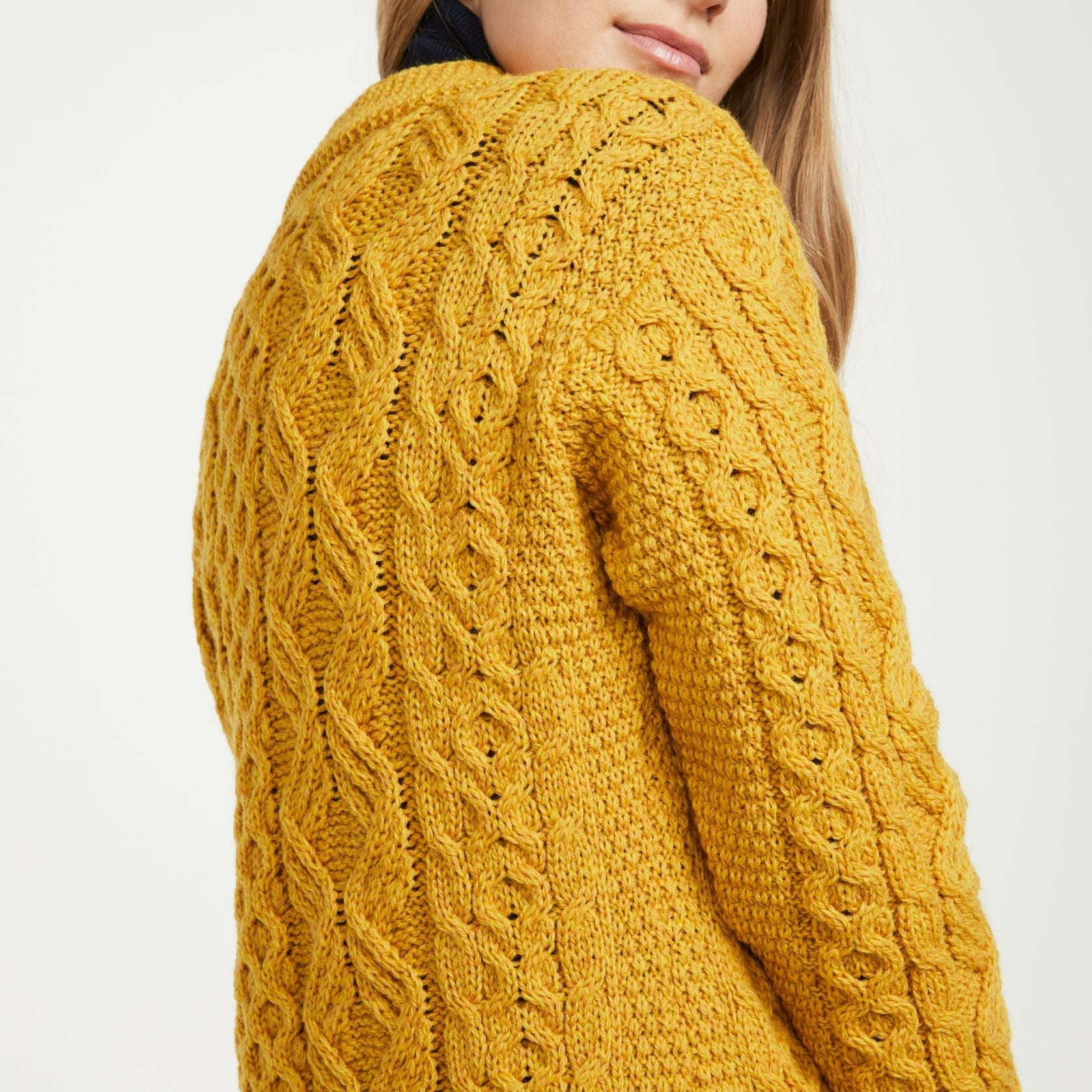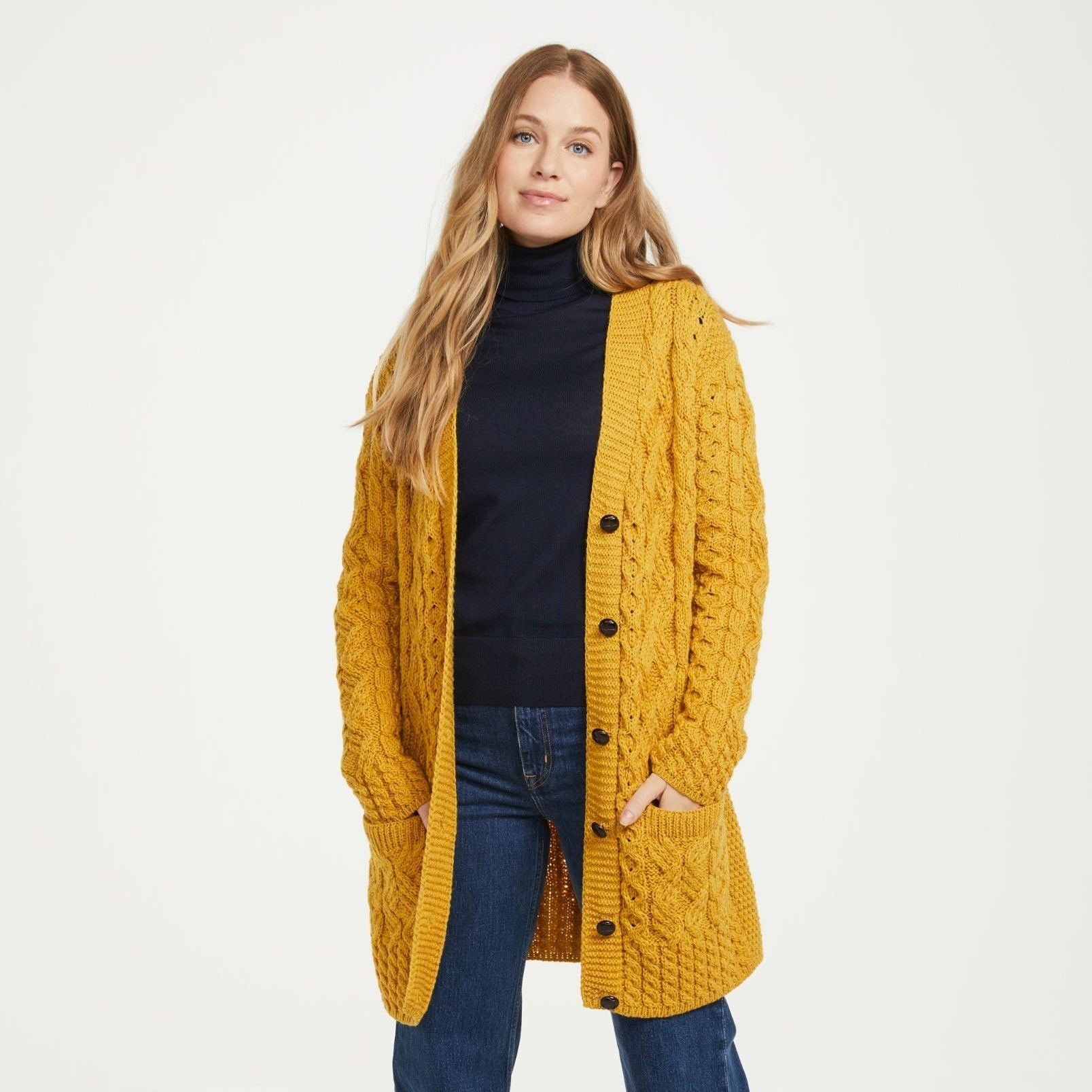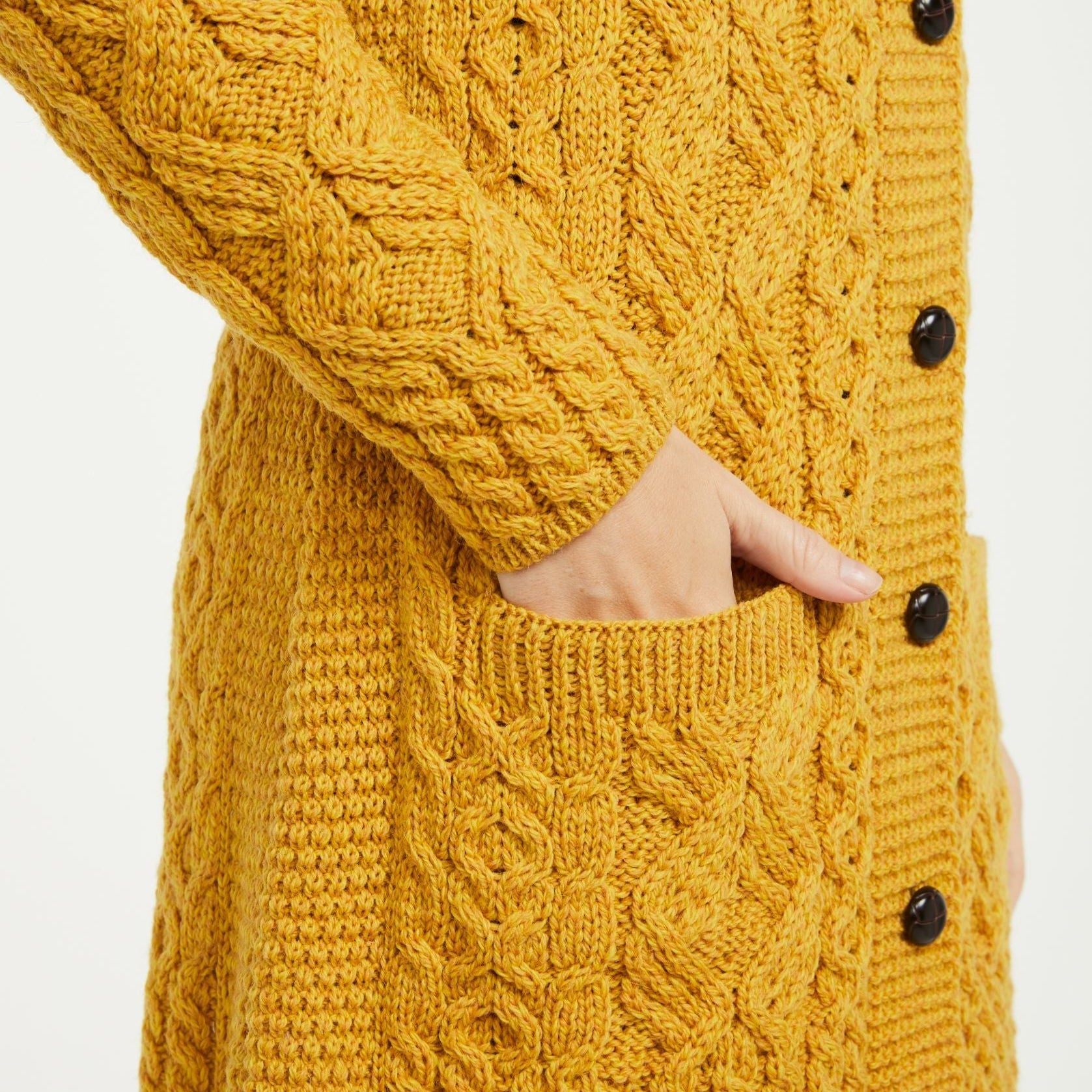 The Glebe Aran Long Line Cardigan is the epitome of comfort and style. This boyfriend style, V-neck, buttoned cardigan brings together a plethora of traditional Aran stitches such as honeycomb, diamond and cable. With delicate moss stitching at the sides and inner sleeve, this piece has a smooth and soft finish, making the overall look feel beautifully gentle.