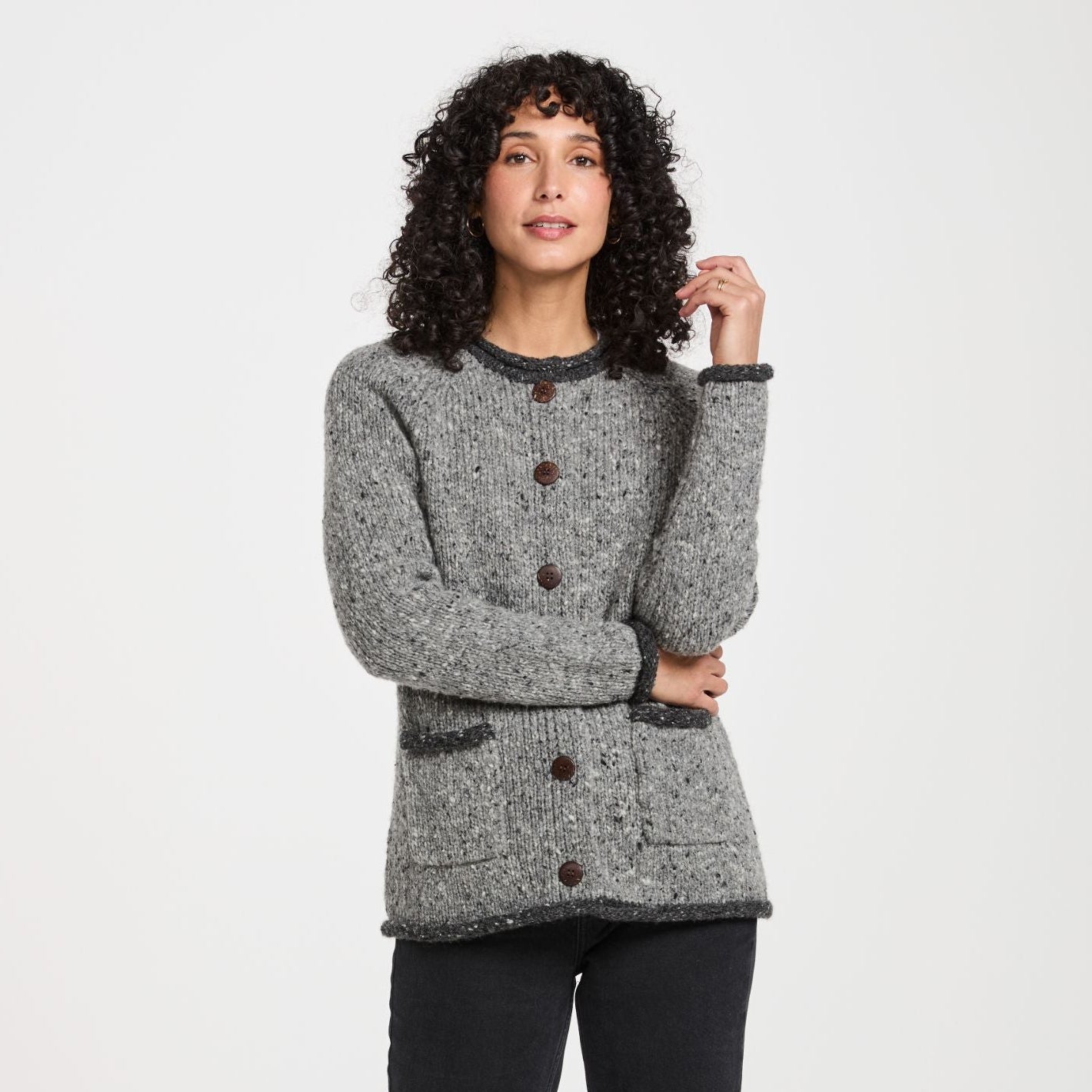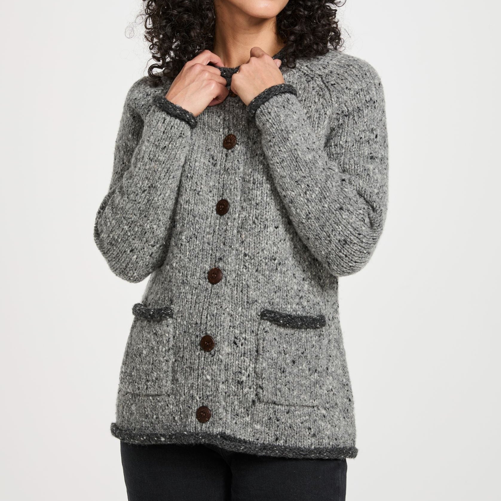 The Glenariff Ladies Raglan Donegal Tweed Grey/Light Cardigan is a fresh take on traditional Irish knitwear. Made from 100% Donegal nepped yarn, it features those distinctive flecks of colour that give tweed its unmistakable character and connection to the Irish landscape.