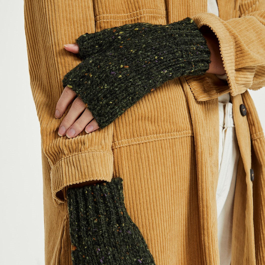 These 100% Donegal Tweed Glenfarne Nepped Fingerless Mitts are a true winter staple. With a generous rib cuff that snugly hugs the wrist, you’ll feel true comfort with every wear. The beautiful plain knit stitch design brings to light the coloured nepps in the yarn, leaving us with a tweed-like finish and a magnificent texture. For an elevated look, why not try layering these over a classic fit leather, full finger glove? Mix and match with the other pieces in this range or allow these mitts the limelight on their own.