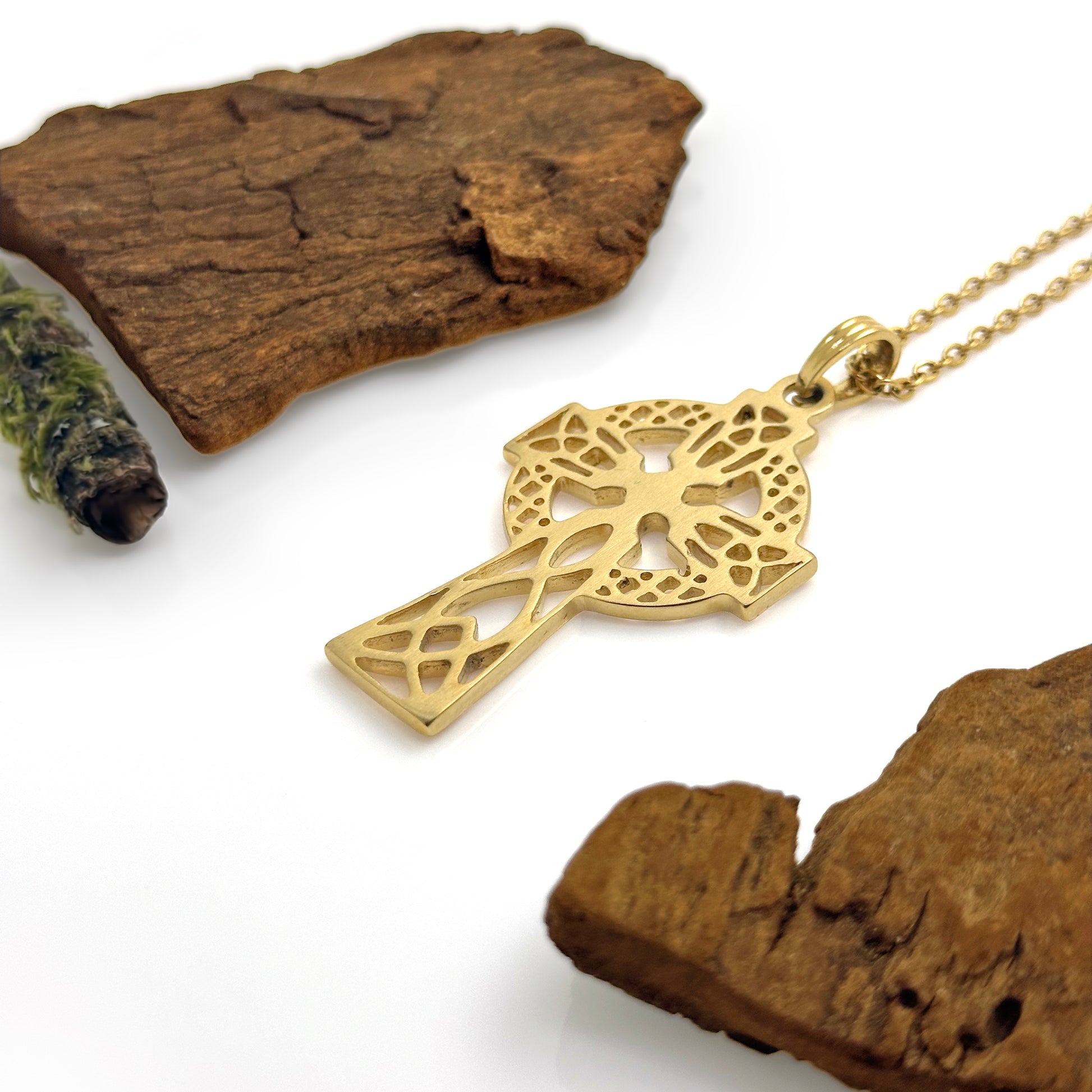 This heavy large men’s gold-plated Celtic cross is built to last. A traditional stainless steel cross necklace. Measuring 33mm wide x 54mm high (not including bale) and 2mm thick, the traditional filigree Celtic knot design has a gold-plated finish and comes fitted with a rugged 20 inch stainless steel chain.