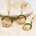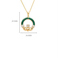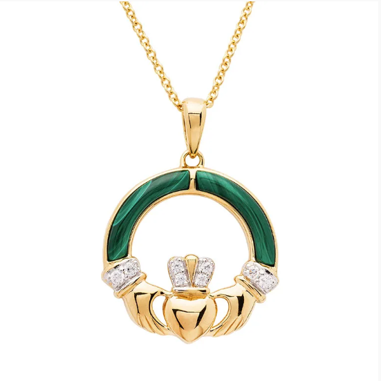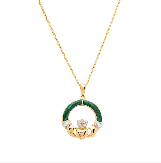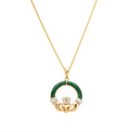 This Shanore Gold Vermeil Malachite Claddagh Necklace deepens precious connections. To begin with, the Claddagh sign of two hands holding a crown signifies love, loyalty and friendship. Plus, the circular pendant also symbolizes neverending bonds. Malachite brings positive transformation. Also, cubic zirconia stones give glimpses of brilliance. Lastly, the yellow gold symbolizes richness and warmth.