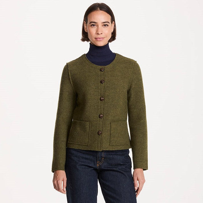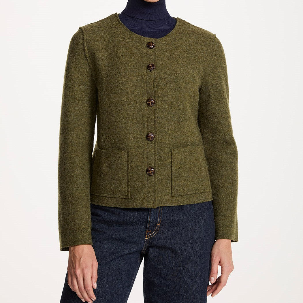 The Green Boiled Wool Collarless Jacket is a confident, structured layer with a strong Irish character. Crafted from 100% pure new wool, the boiled finish gives it a firm yet comfortable feel that holds its shape beautifully. The collarless, deconstructed style keeps the look clean and modern, while the gently fitted cut creates a flattering silhouette without restricting movement. Five traditional Aran-style football buttons run down the front, adding subtle heritage detail. An inside facing keeps the neckline neat, and two patch pockets bring everyday practicality. Unlined for ease and flexibility, it’s a versatile piece that works effortlessly across seasons.