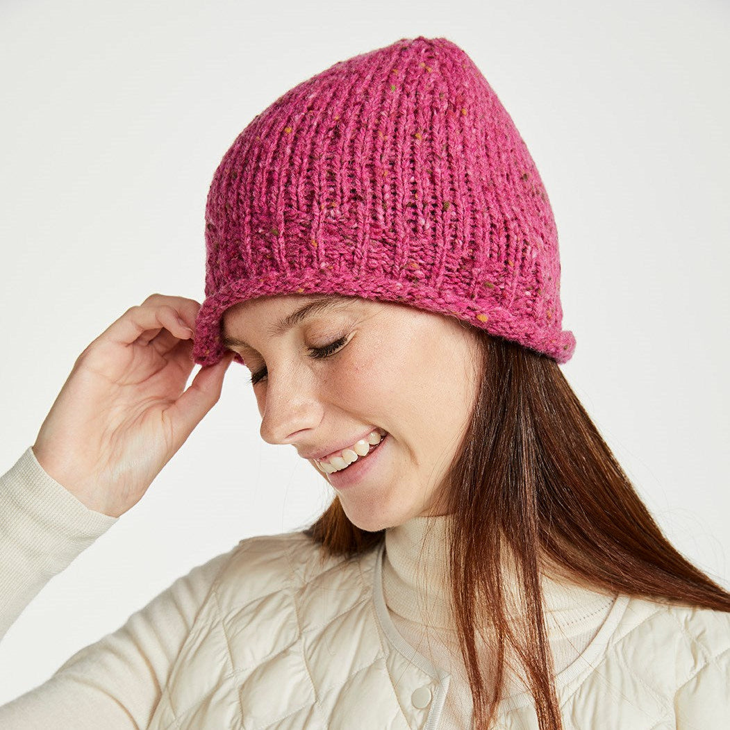 The Hazelwood Roll Hem Beanie is the perfect addition to your capsule wardrobe, if you’re in search of a high quality, cosy hat to keep you warm and stylish all winter. This beanie style hat with a rolled edge is crafted with a plain stitch, highlighting the coloured nepps in the yarn, for an earthy, textured, natural look. In a selection of truly mesmerising colours, you will easily pair this with other pieces from our Aran range.