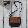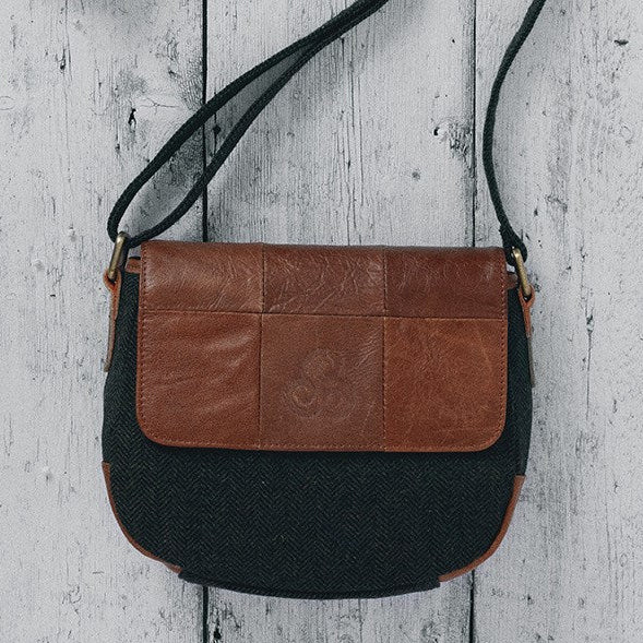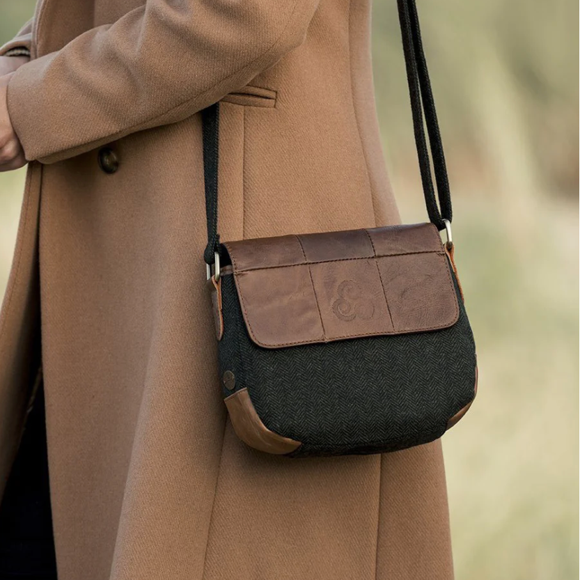 Black and dark green herringbone tweed and leather bag with tan leather flap and adjustable herringbone tweed shoulder strap. With AWM embossed logo on the centre of the leather patchwork flap and a branded antique brass finished oval metal disc at the side edge. A metal zip fastens the bag, which houses various compartments including a zipped back pocket. The hardware has an antique brass finish. Crafted in 100% woollen tweed and brown leather, with brown polyester fabric lining, this flap bag is part of a herringbone tweed and leather handbag collection. Designed in Ireland. Dimensions: Height 20cm (7.5" approx.) Depth of base 7cm (3" approx.) Width 25cm (10" approx.)